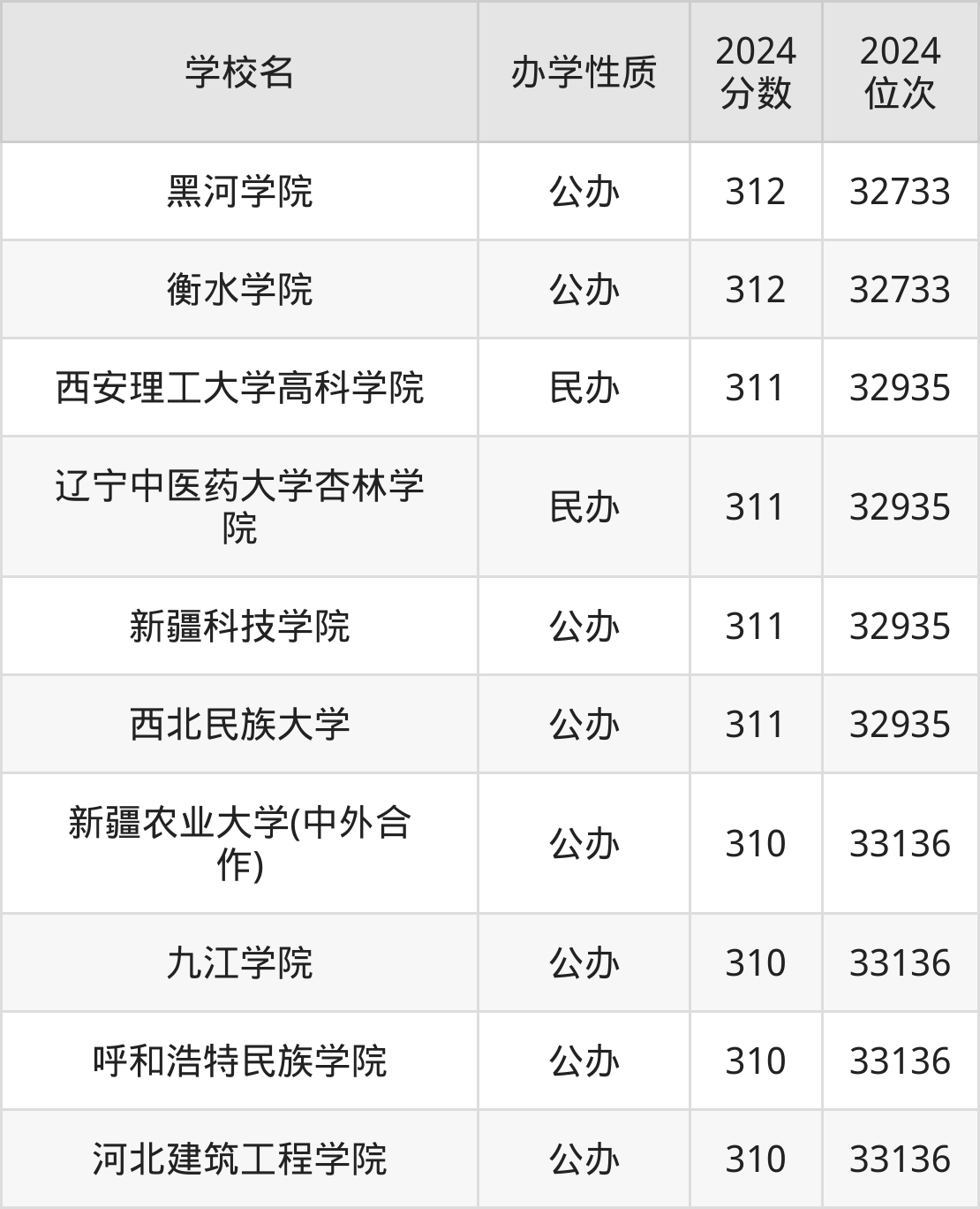 2024年新疆理科二本线是262分,线上49分,即311分。本文筛选310分到312分之间的大学名单汇总。