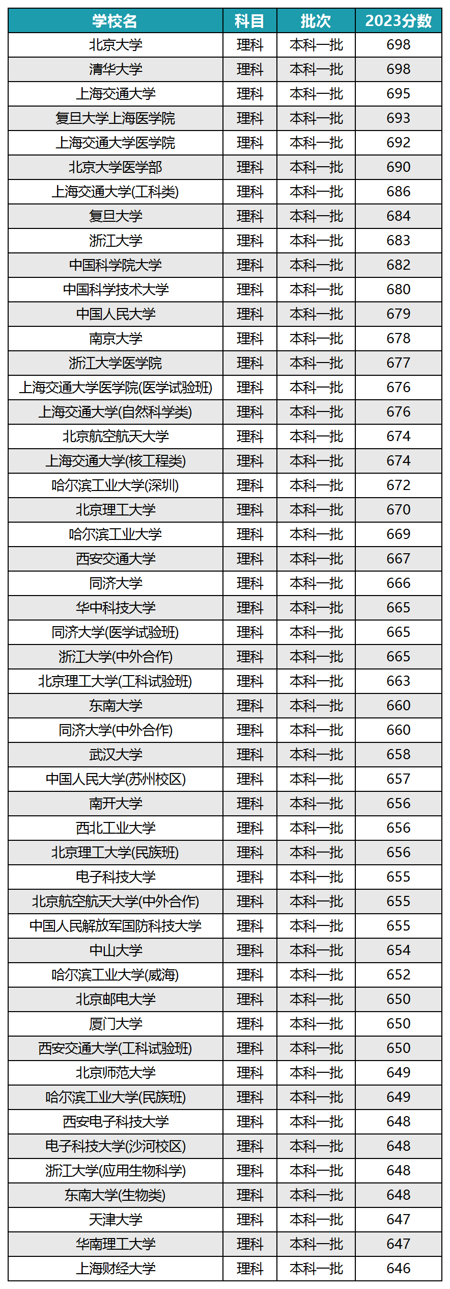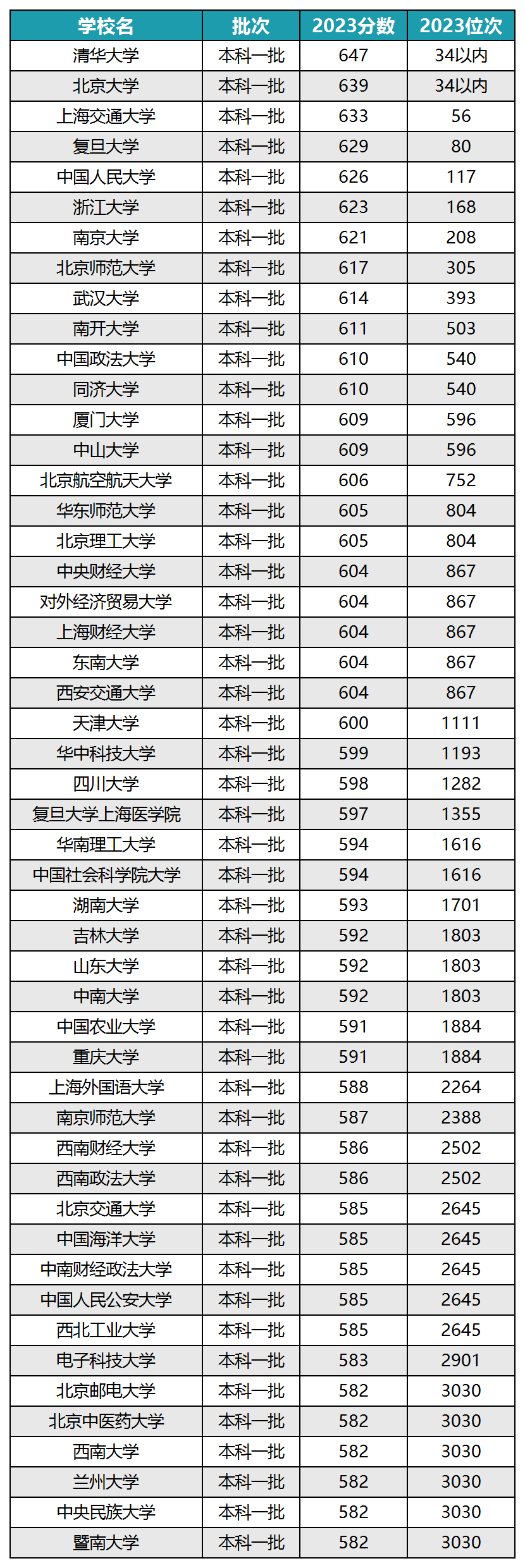 2024年国内一本大学大多数为985和211大学或者部委直属大学,比如说大家众所周知的清华、北大、浙大、复旦等,以2023年四川省高考为例,清华在文科最低分647分、理科698分,北大文科639分、理科698分。