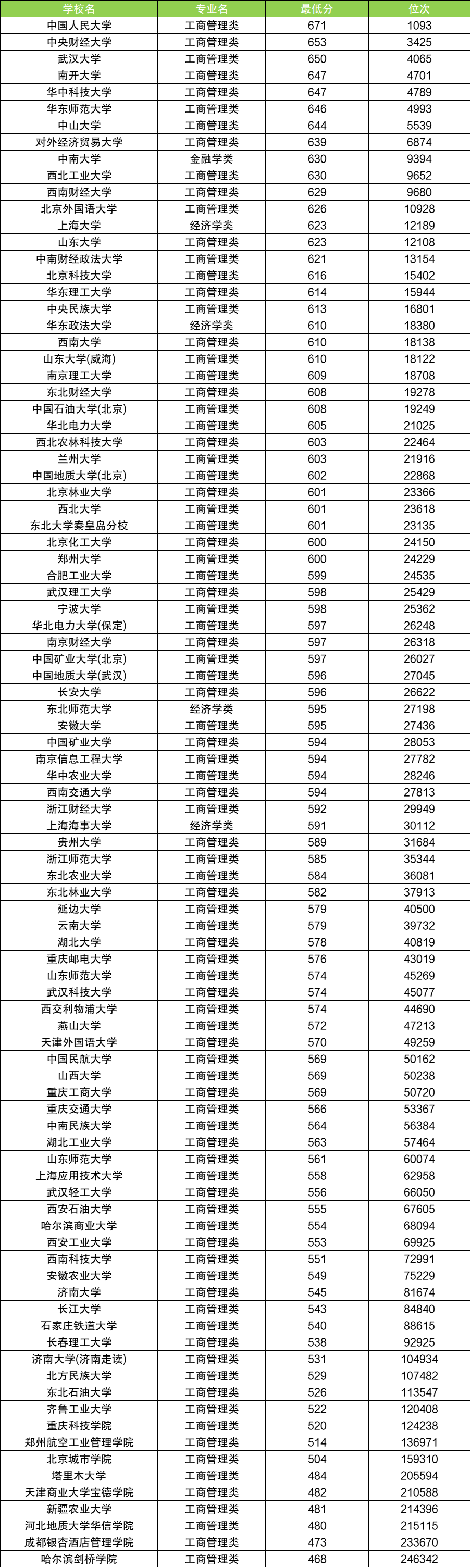 中国人民大学(工商管理类)最低分671分,对应位次1093名;