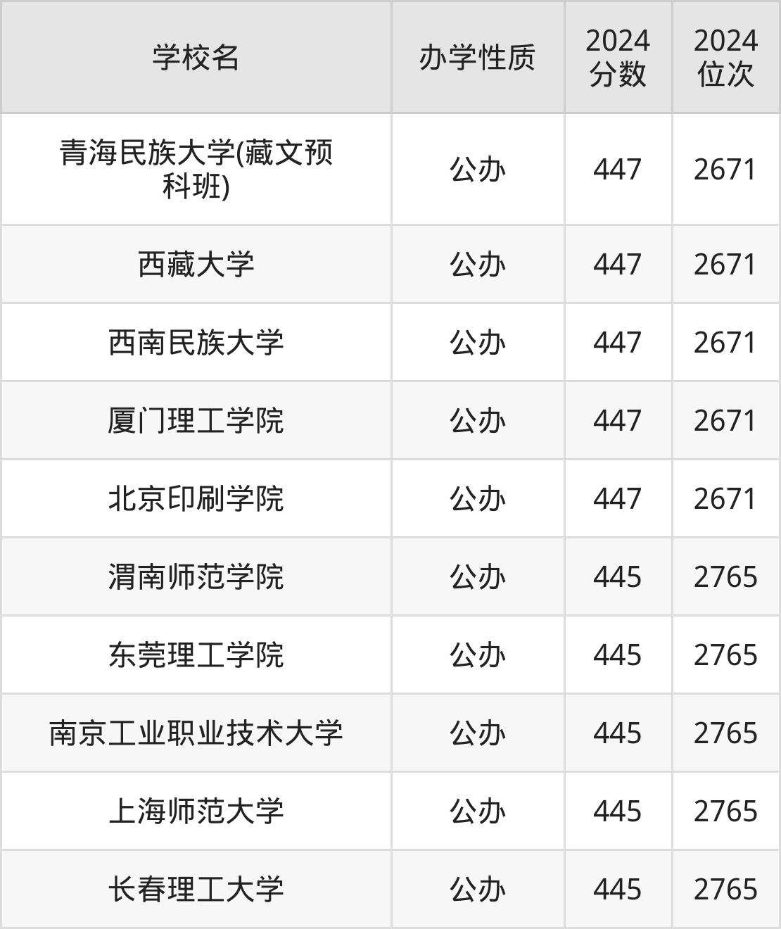 2024年青海文科二本线是382分,线上64分,即446分。本文筛选445分到447分之间的大学名单汇总。