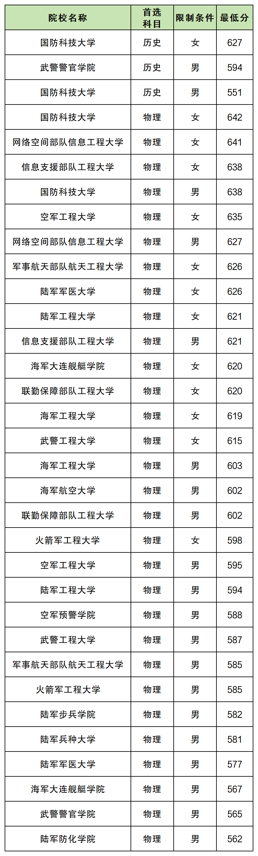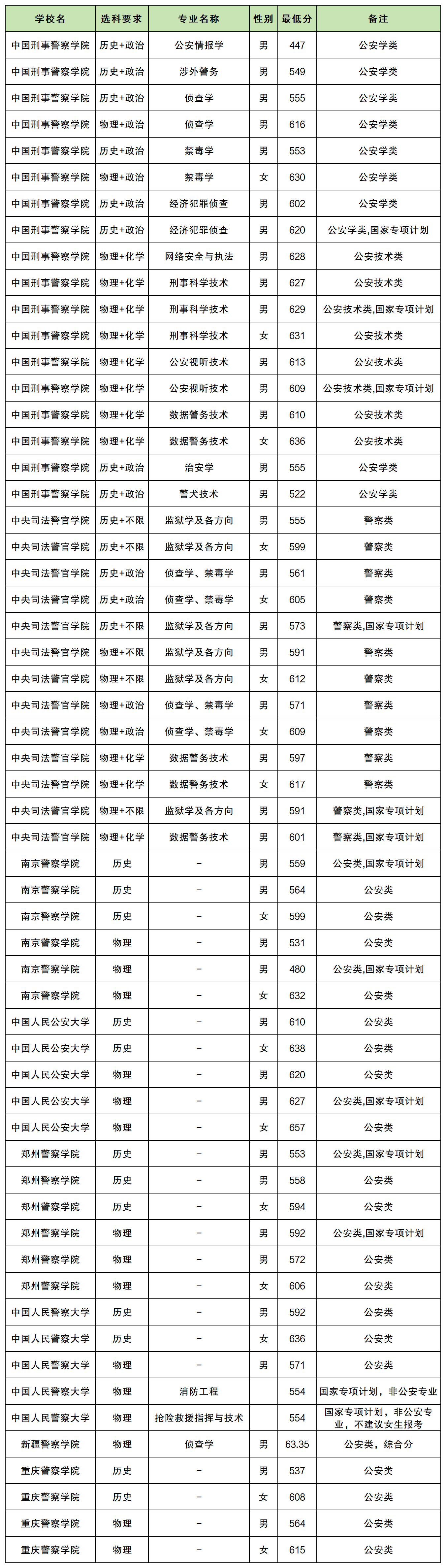历史类:最低447分,对应中国刑事警察学院公安情报学专业(男生)。