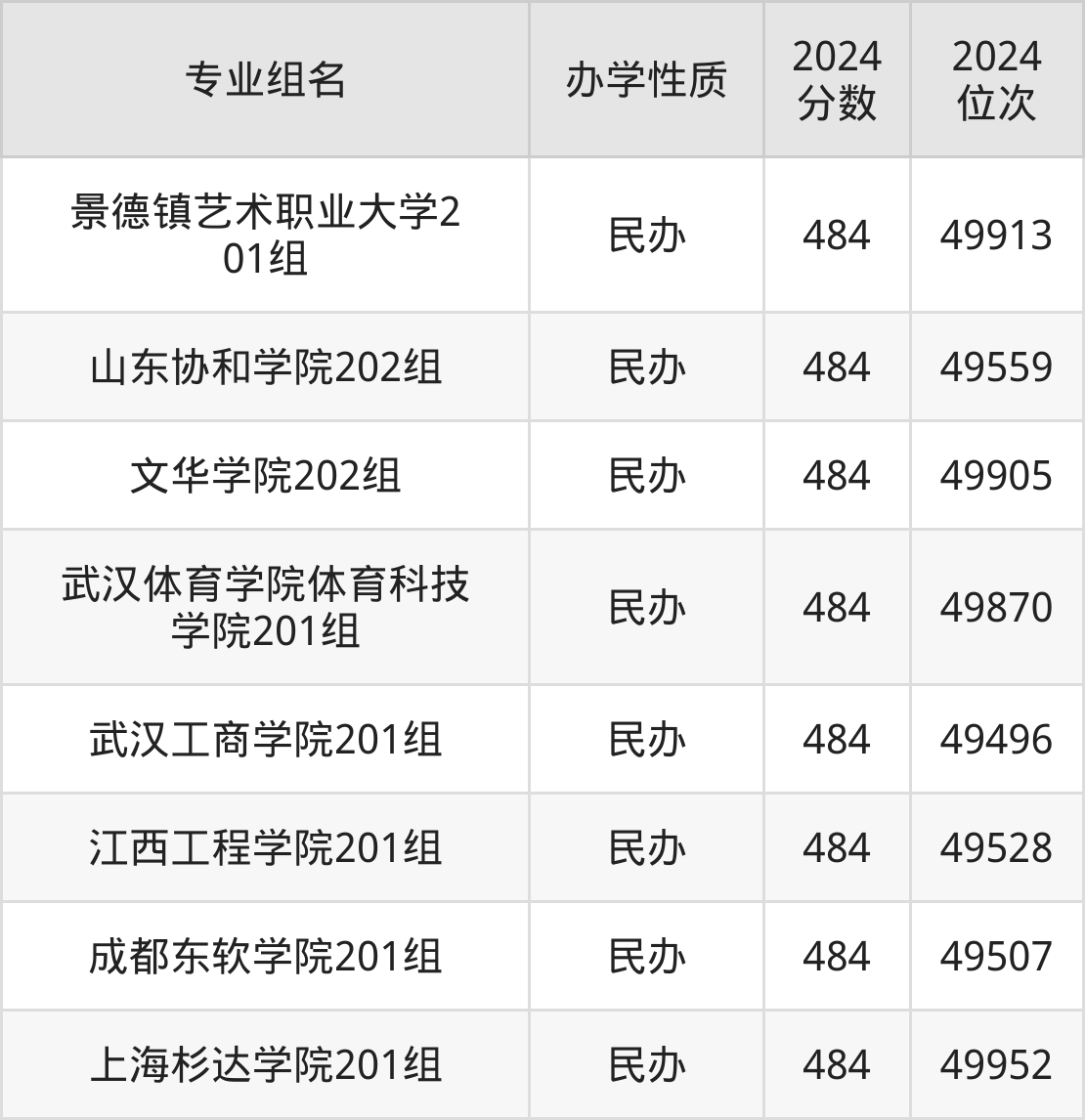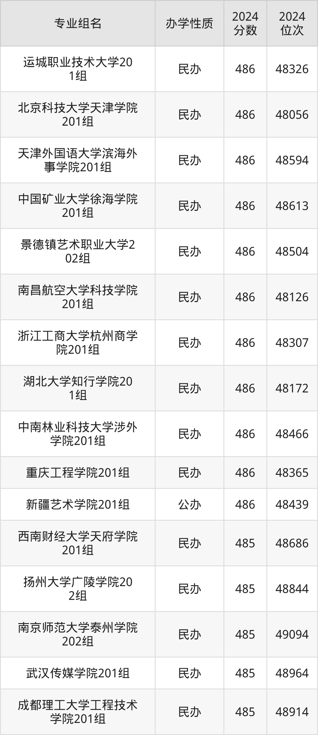 本科线上57分左右的历史组本科生可以报考的学校多数为民办本科,能上的公办本科有4所,包括486分的新疆艺术学院201组、485分的嘉应学院224组(联合培养)、485分的嘉应学院223组(联合培养)、485分的沈阳师范大学201组(中外合作)。