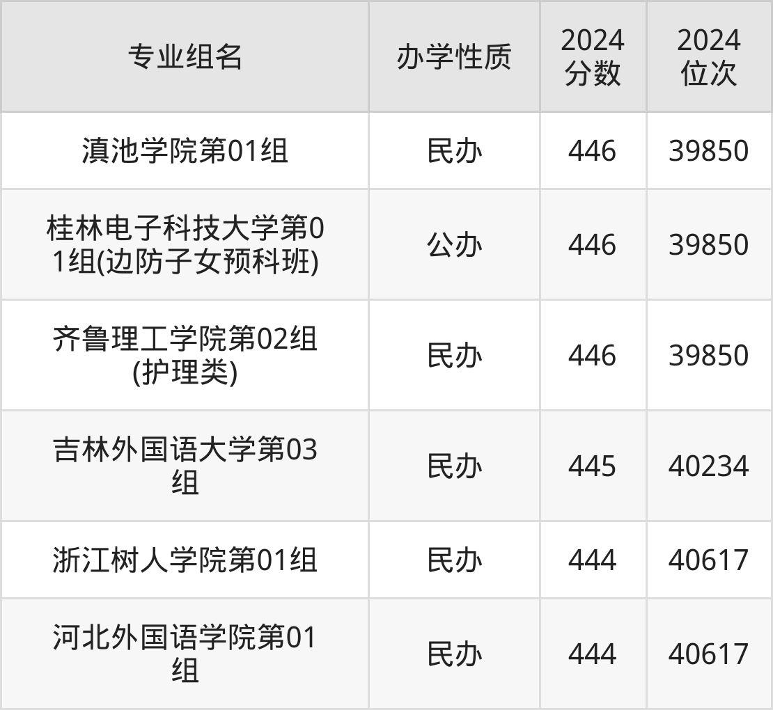 本科线上13分左右的历史组本科生可以报考的学校多数为民办本科,能上的公办本科有1所,包括446分的桂林电子科技大学第01组(预科班)。