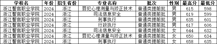 2024年浙江警官职业学院在浙江招警校的分数范围在598分-658分之间,其中男生最低分为598分(罪犯心理测量与矫正技术);女生最低分为632分(司法信息安全)。