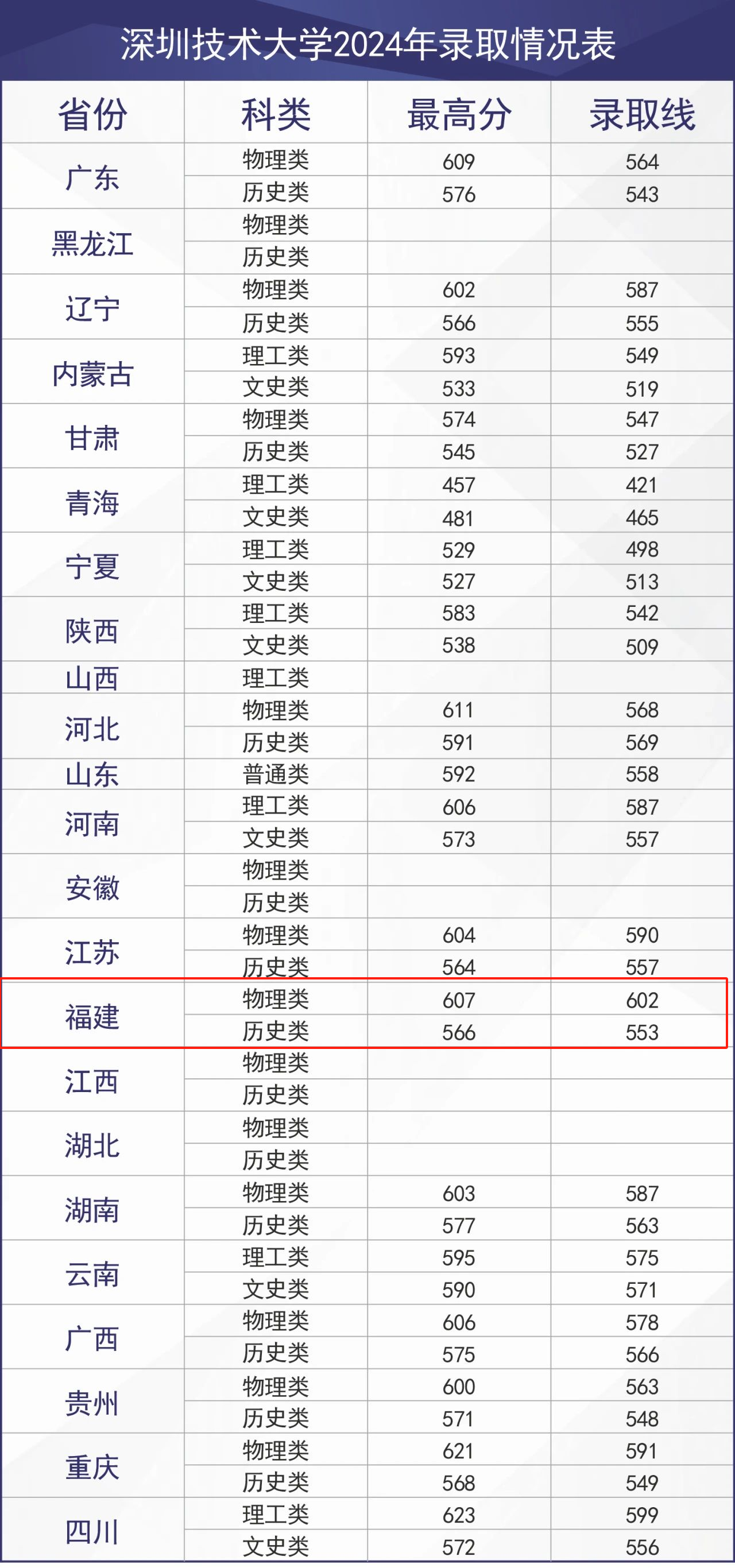福建省:物理类最低分602分,历史类最低分553分。