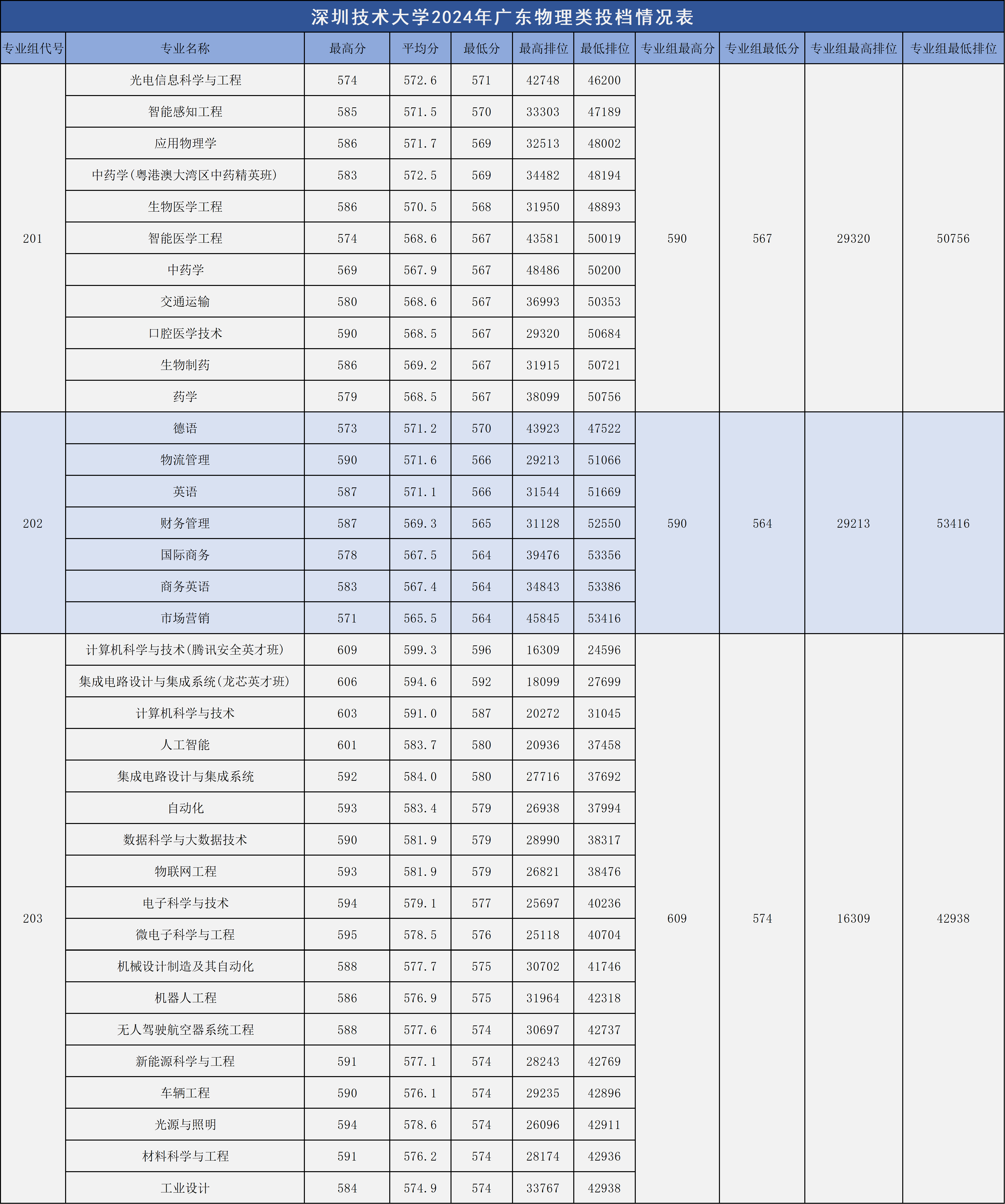 2024年深圳技术大学在广东省物理类招生专业组有3个(201组、202组、203组),最低分专业组为202组,2024年最低投档分为564分,对应最低位次是53416位,相较2023年上涨了5325位。