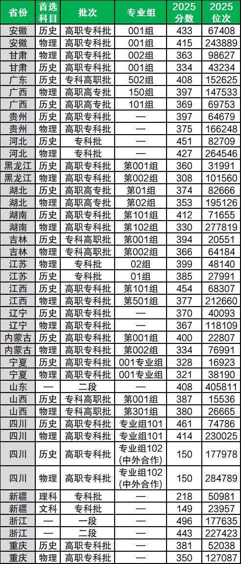 2、区域差异:学校在四川省内招生占比超90%,外省招生计划较少且分数线波动较大。例如,2025年浙江省专科录取最低分461分(超专科线311分),新疆专科录取最低分149分(文科)。若2026年本科批次拓展至外省,分数线或参考当地本科线及学校招生计划动态调整。