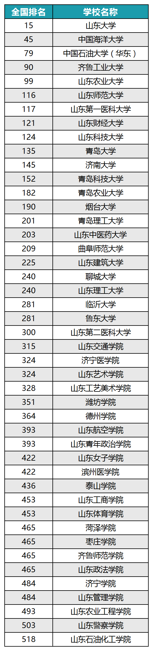 根据2024年校友会中国大学最新排名,山东省有45所本科大学跻身山东最好的大学排行榜,而山东省排名前十名的大学有山东大学、中国海洋大学、中国石油大学(华东)、齐鲁工业大学、山东农业大学、山东师范大学、山东第一医科大学、山东财经大学、山东科技大学、青岛大学。这前10强本科大学的全国排名都在150名以内,而广东省内的大学中,全国排名在500名以外的还有山东石油化工学院和山东警察学院。