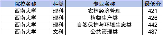 学校高校专项计划文科最低分数线是487分,对应的招生专业是公共管理类;理科最低分数线是421分,对应的招生专业是农林经济管理。
