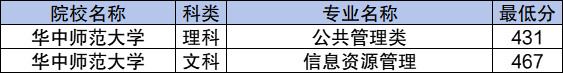 学校高校专项计划文科最低分数线是467分,对应的招生专业是信息资源管理;理科最低分数线是431分,对应的招生专业是公共管理类。