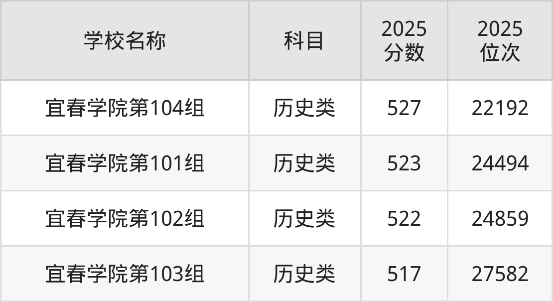 下文为2025年宜春市本科大学在江西历史类录取分数线和位次排名表,供大家参考:
