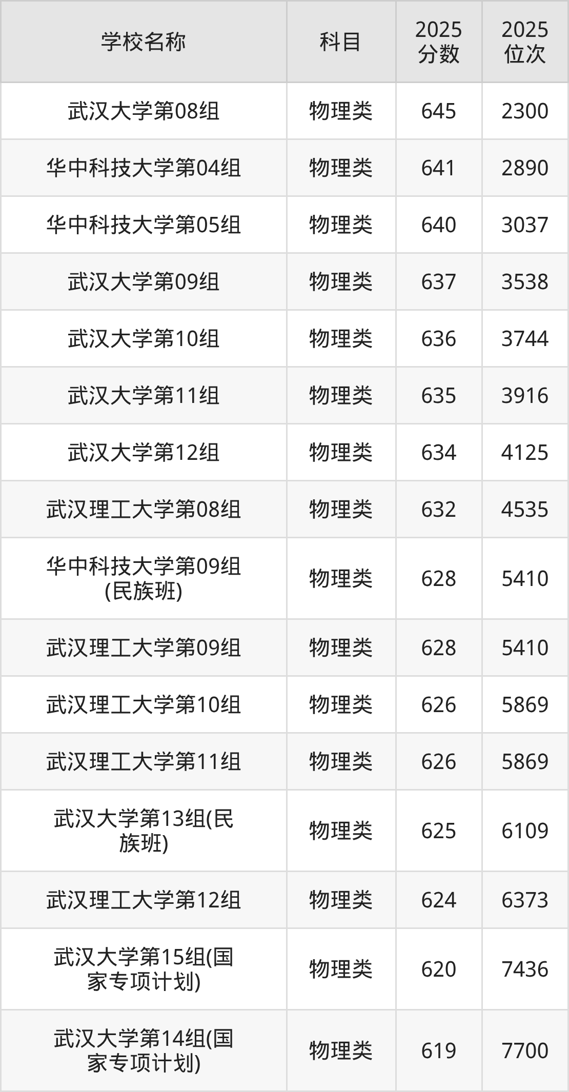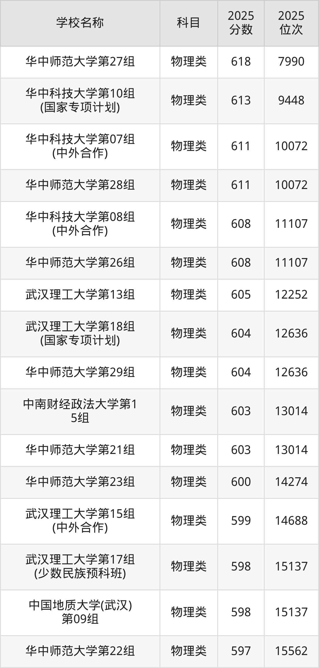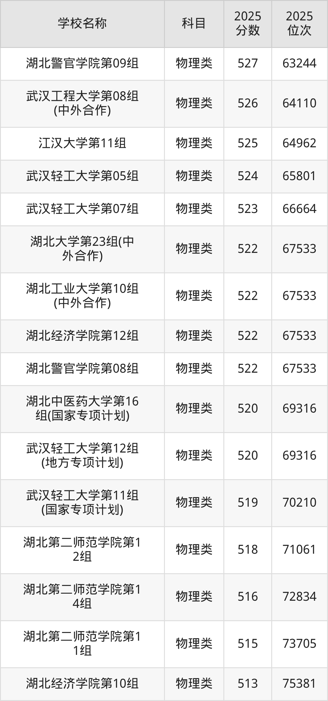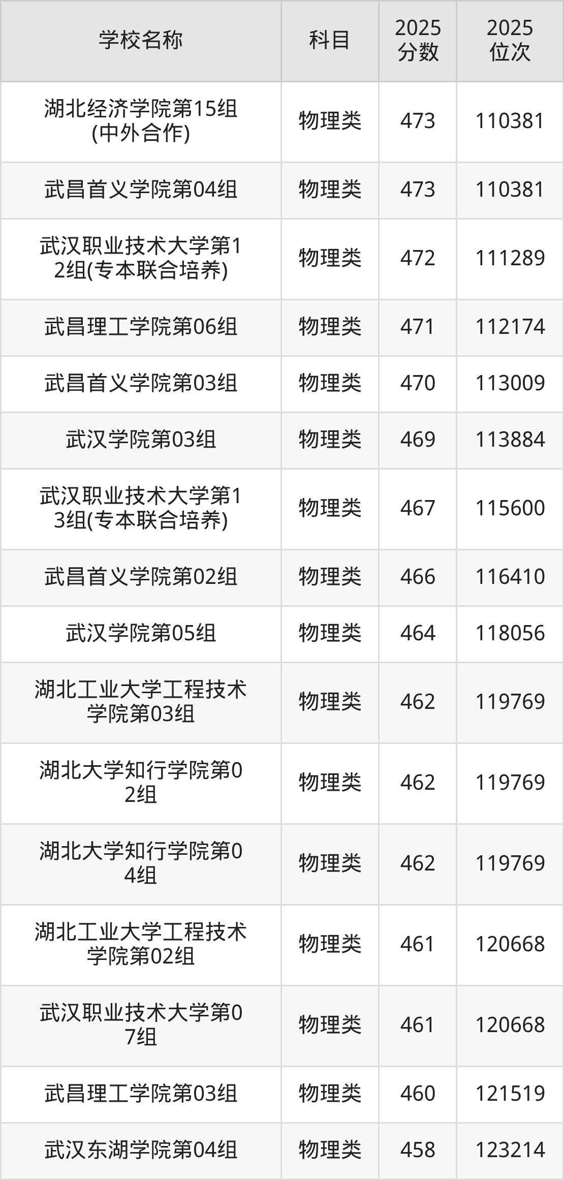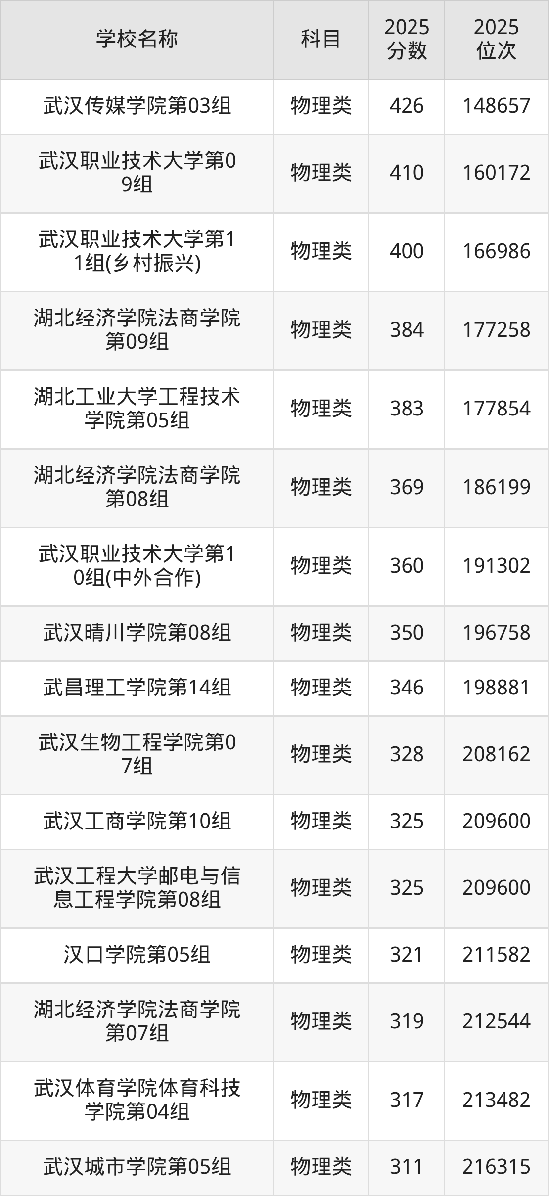 下文为2025年武汉市本科大学在湖北物理类录取分数线和位次排名表,供大家参考: