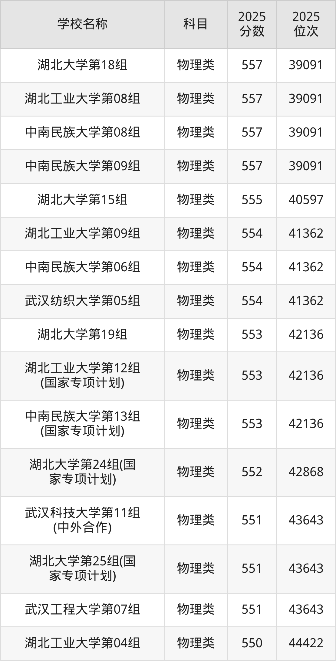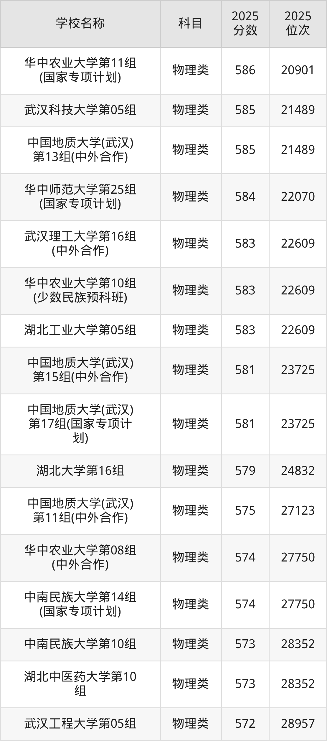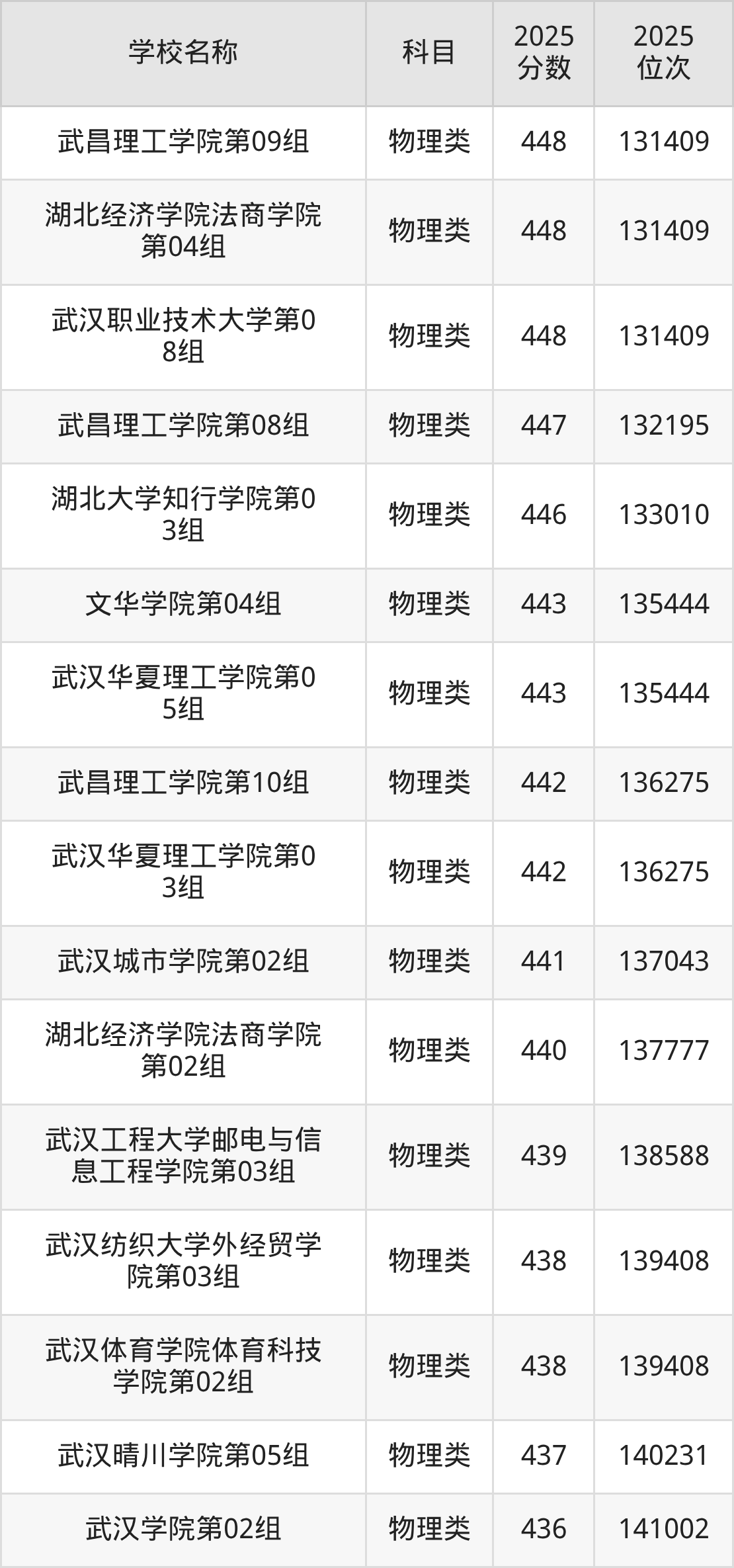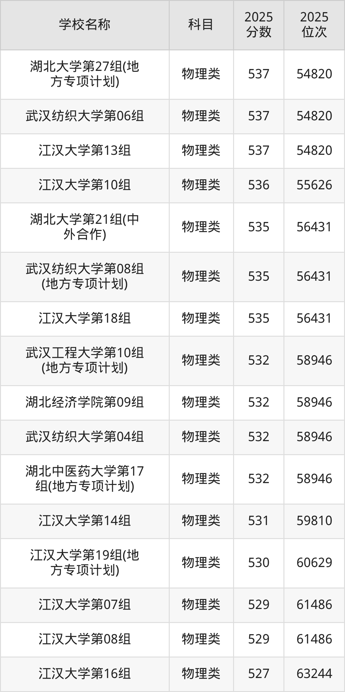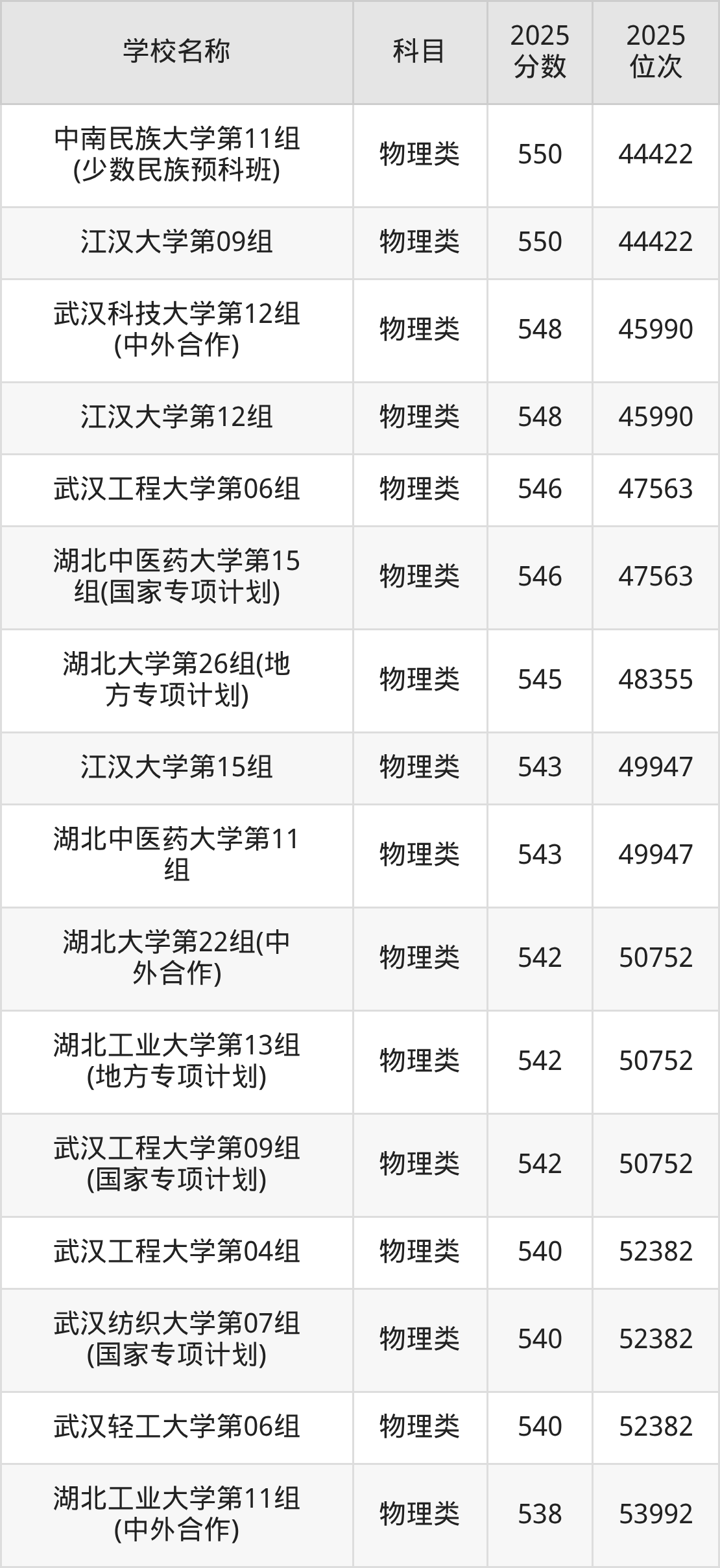 下文为2025年武汉市本科大学在湖北物理类录取分数线和位次排名表,供大家参考:
