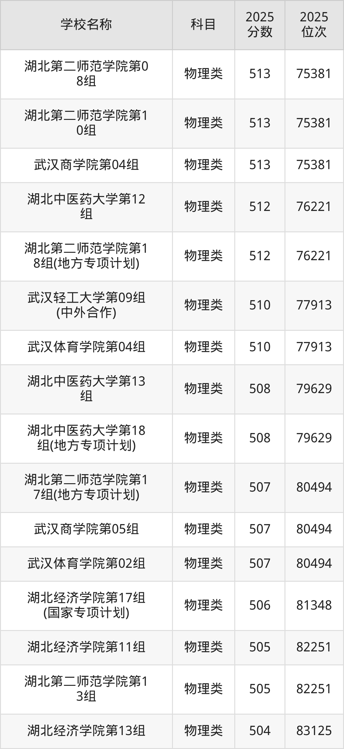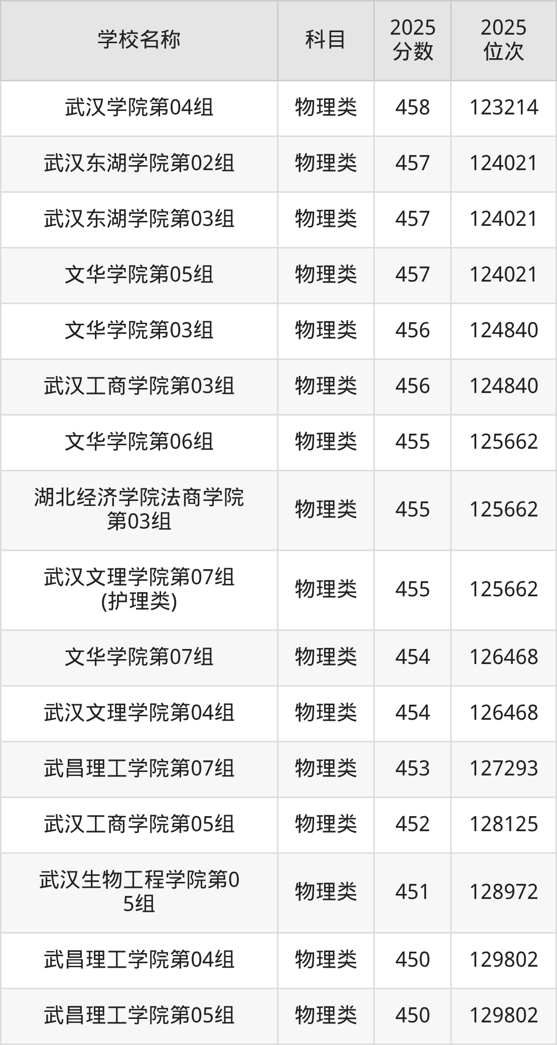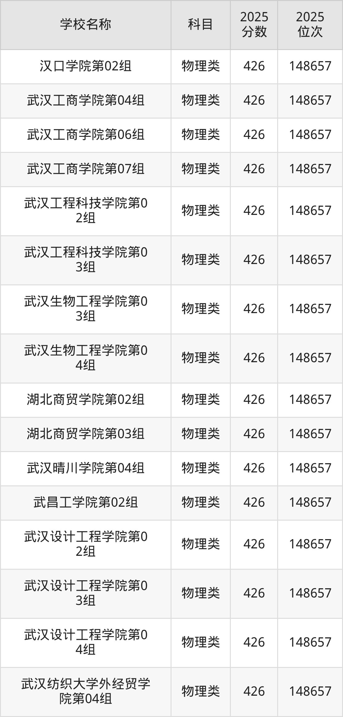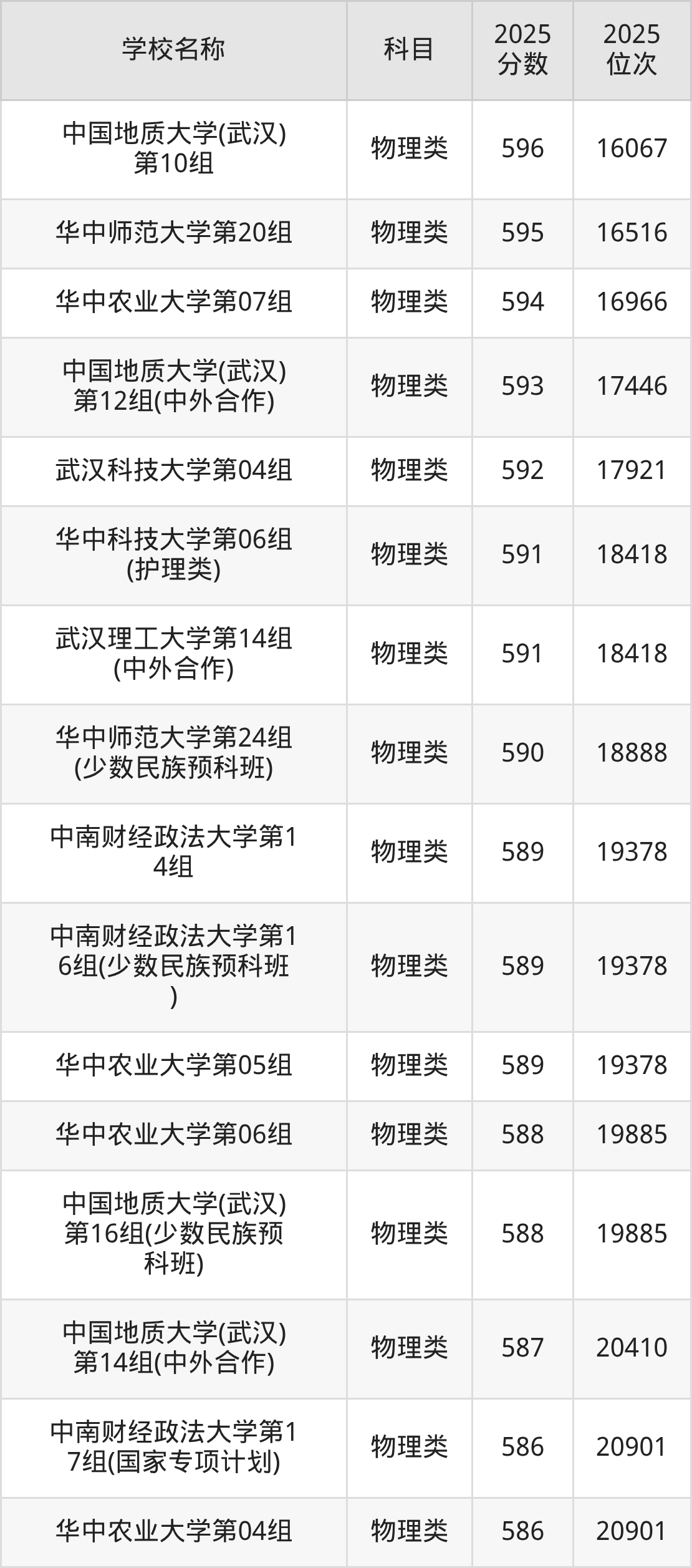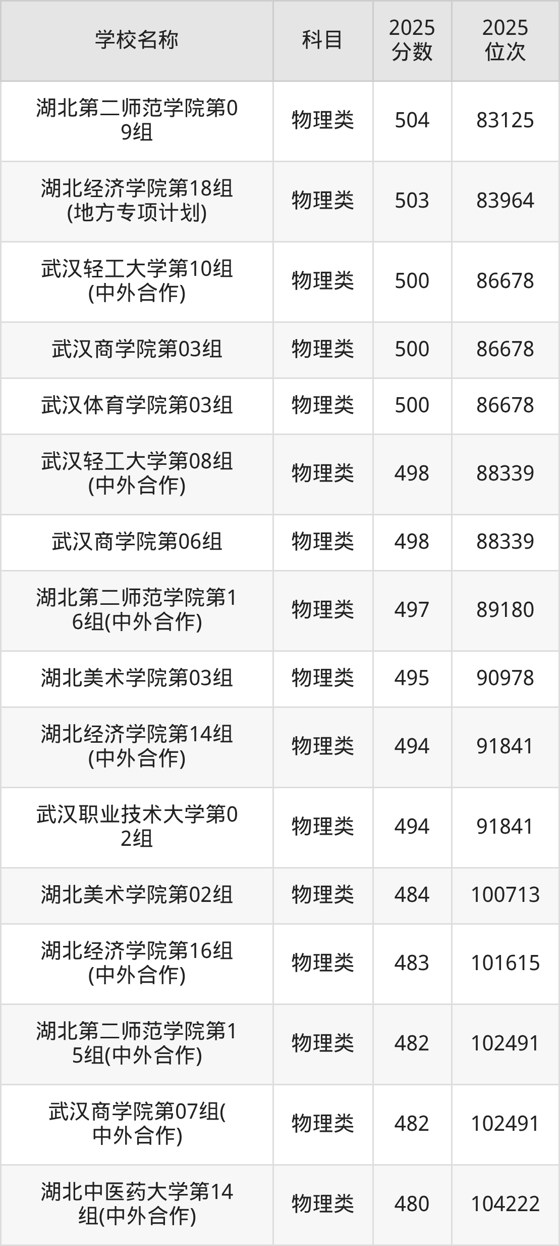 下文为2025年武汉市本科大学在湖北物理类录取分数线和位次排名表,供大家参考: