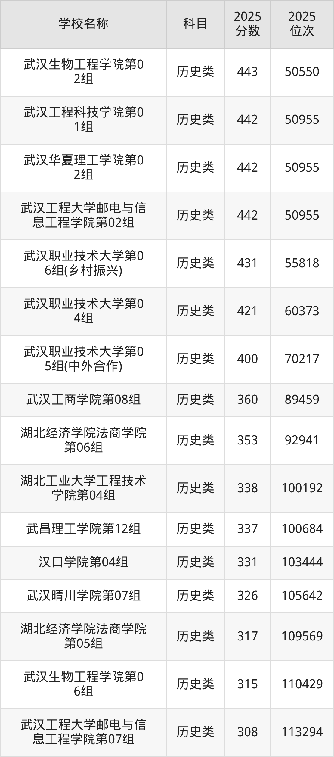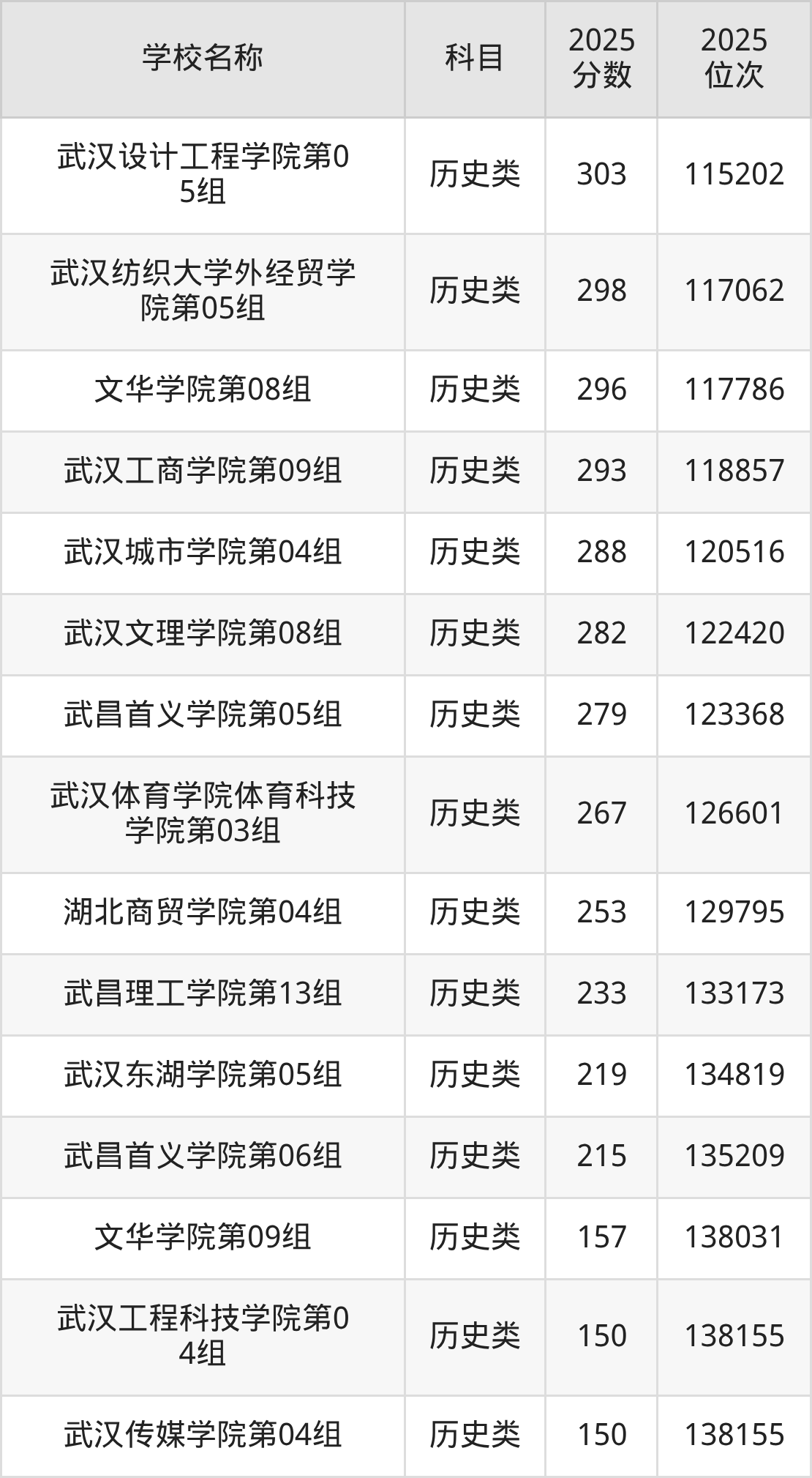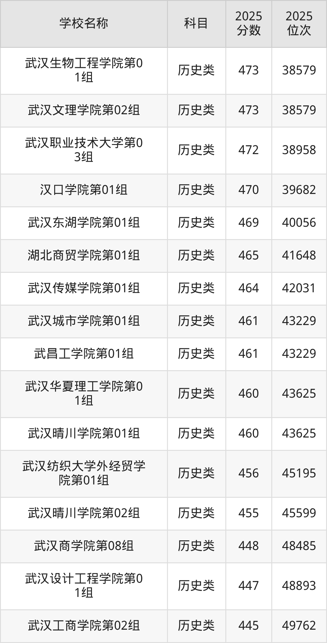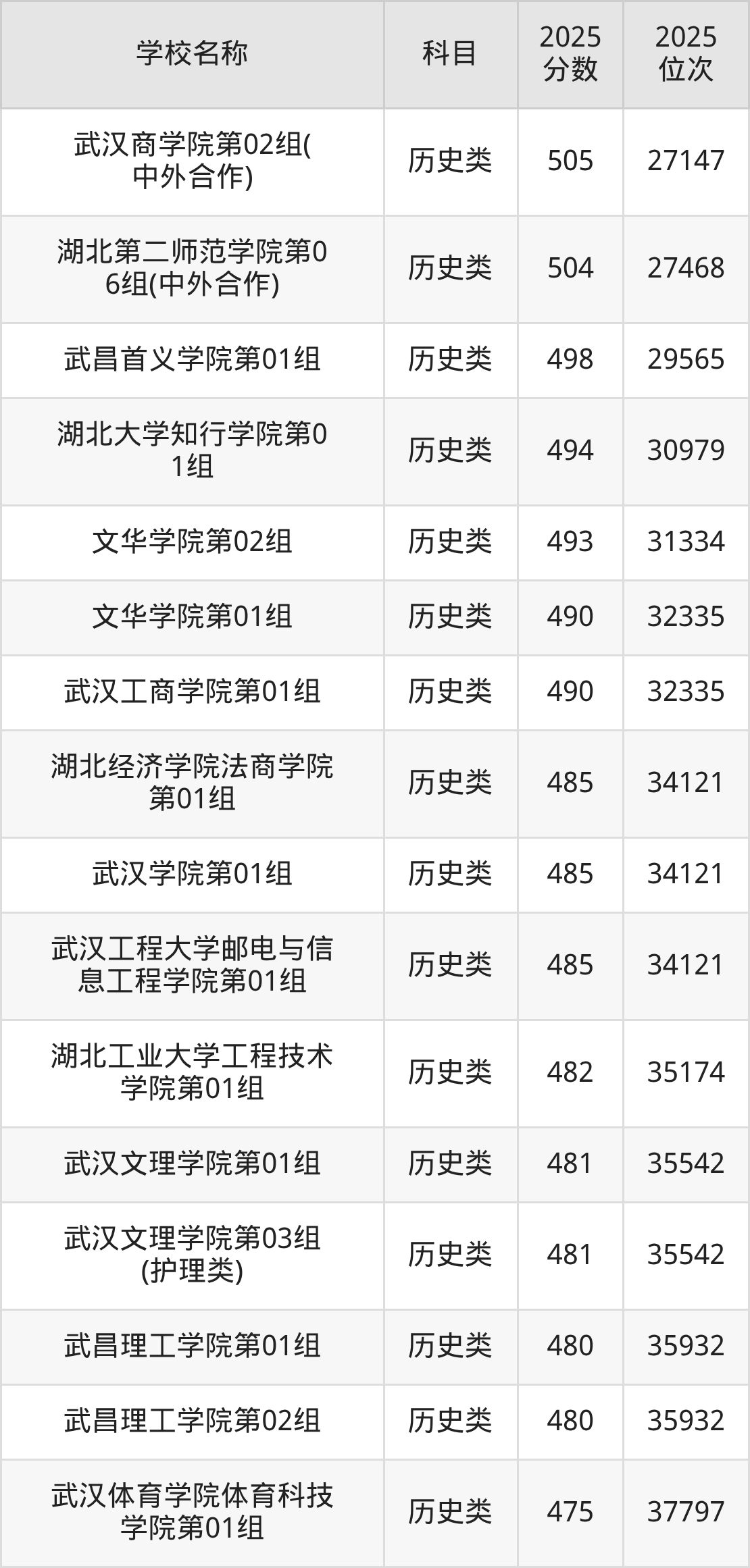 下文为2025年武汉市本科大学在湖北历史类录取分数线和位次排名表,供大家参考: