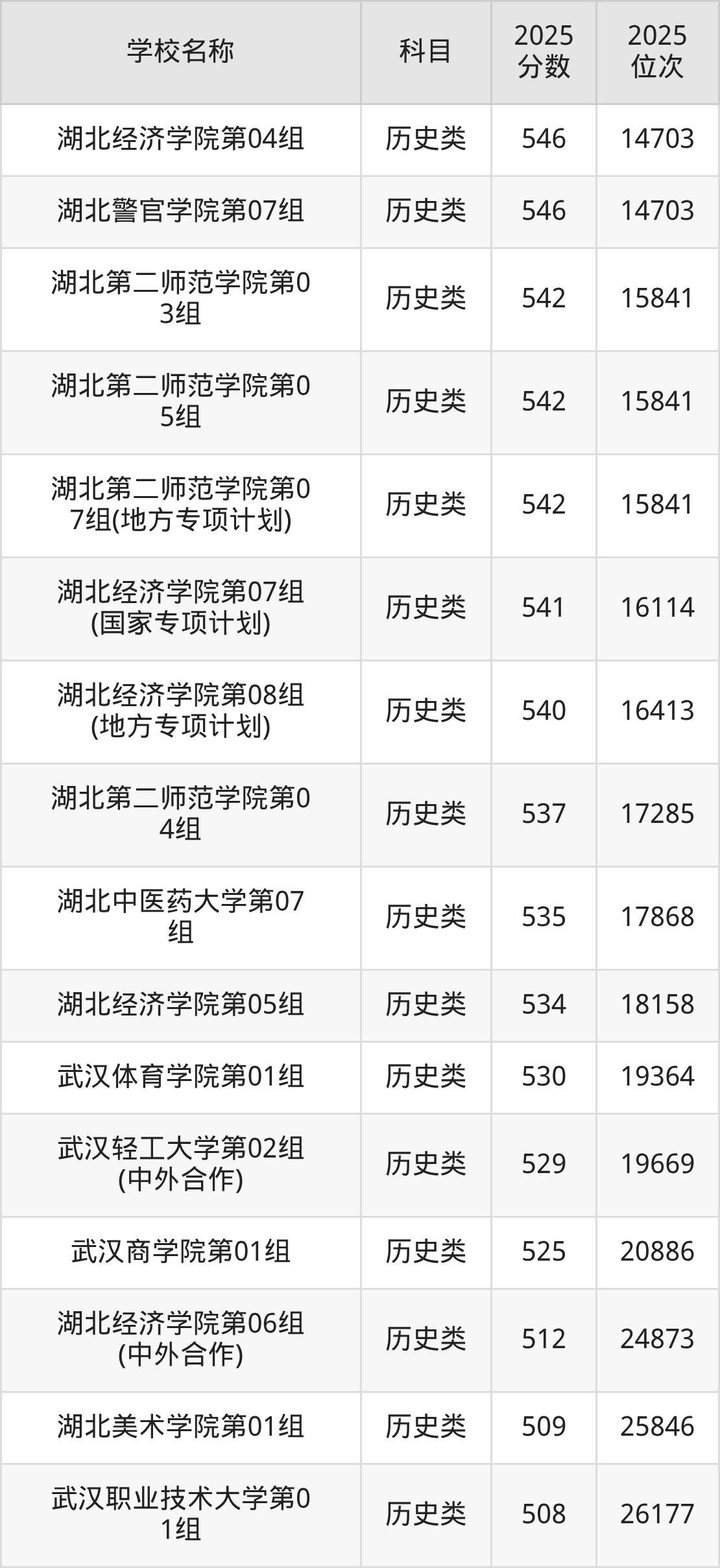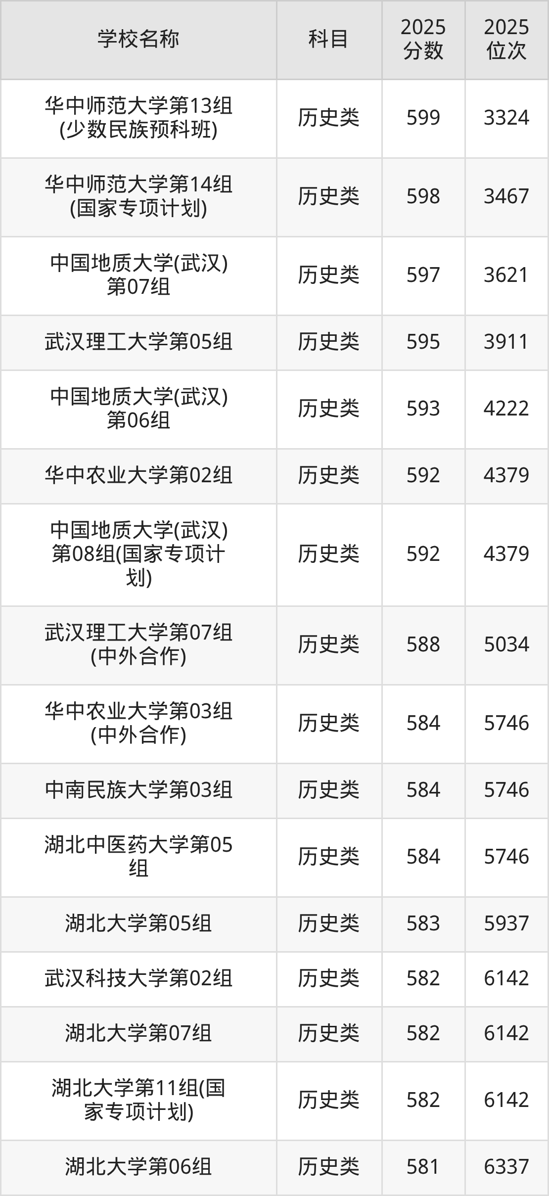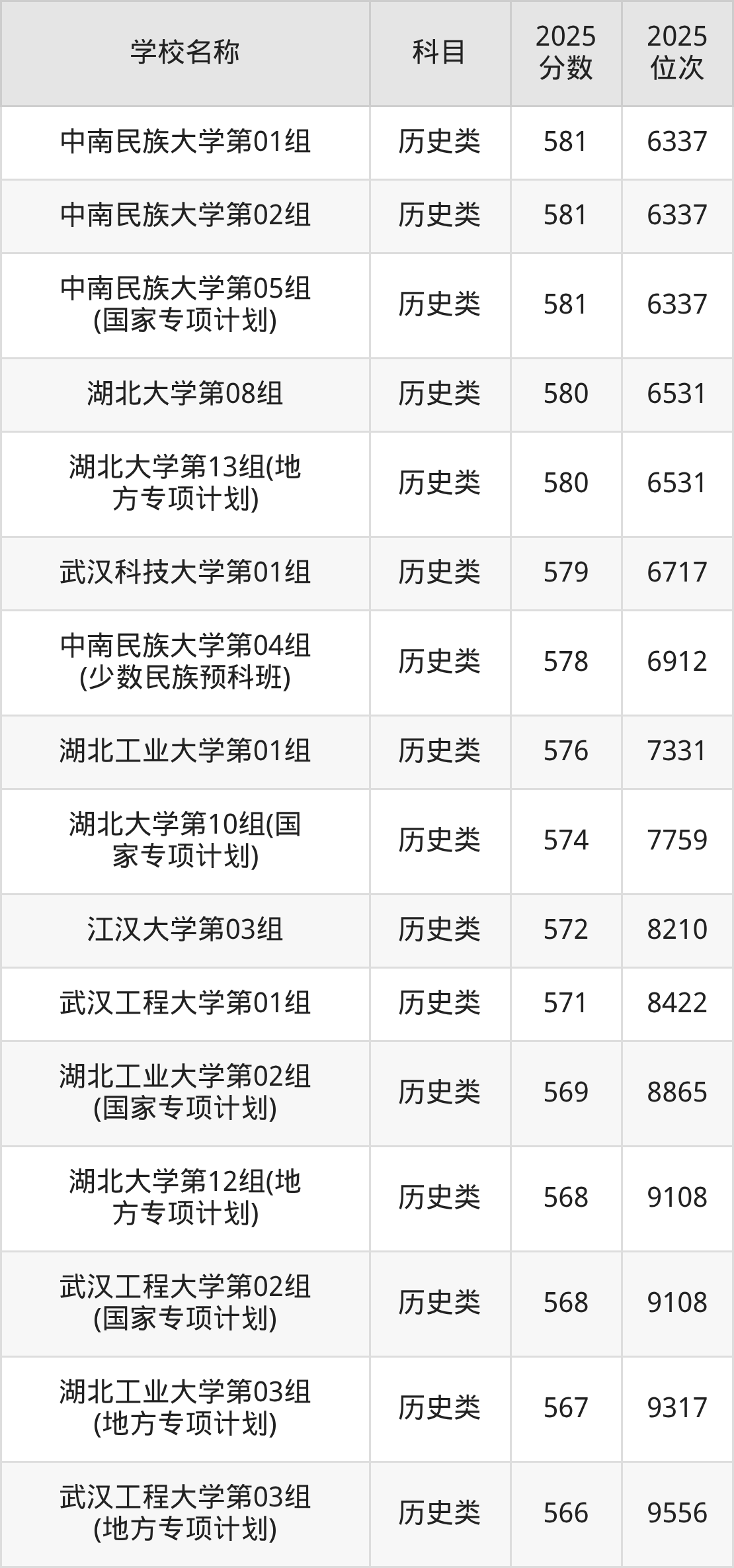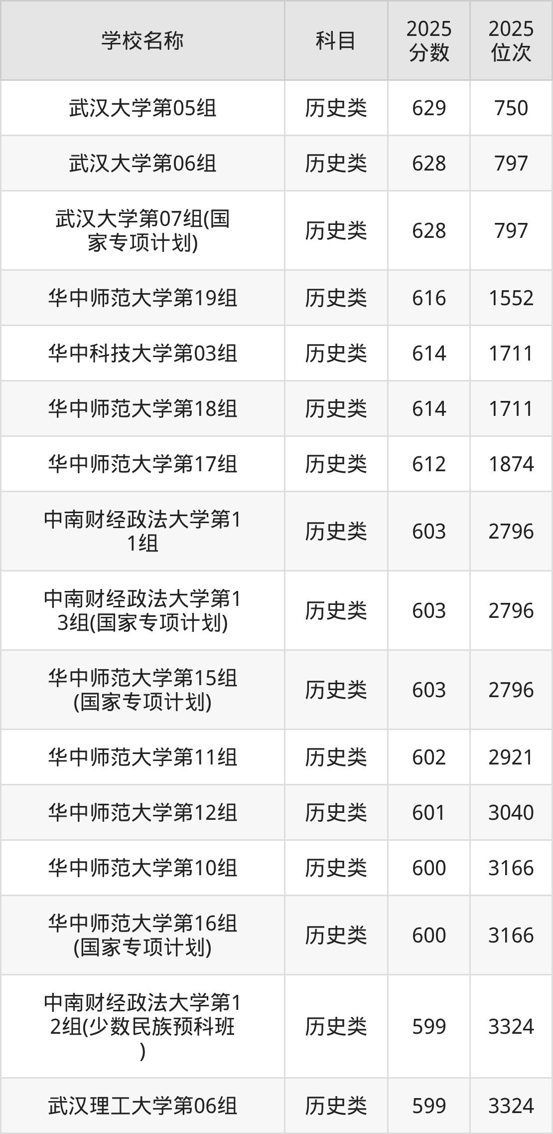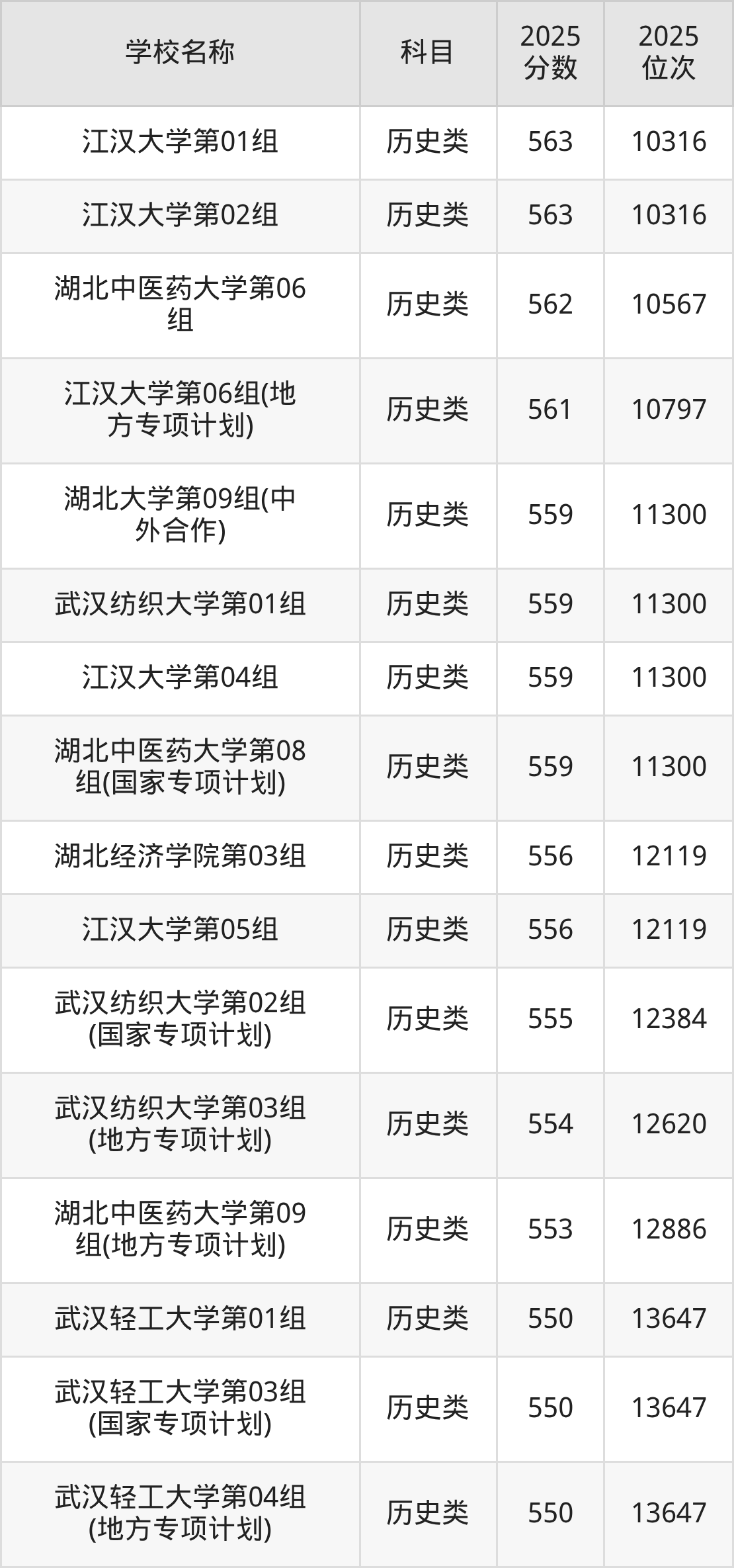 下文为2025年武汉市本科大学在湖北历史类录取分数线和位次排名表,供大家参考: