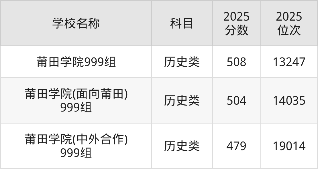 下文为2025年莆田市公办二本大学在福建历史类录取分数线和位次排名表,供大家参考: