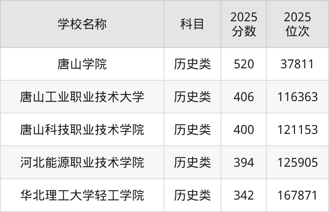 下文为2025年唐山市理工类大学在河北历史类录取分数线和位次排名表,供大家参考: