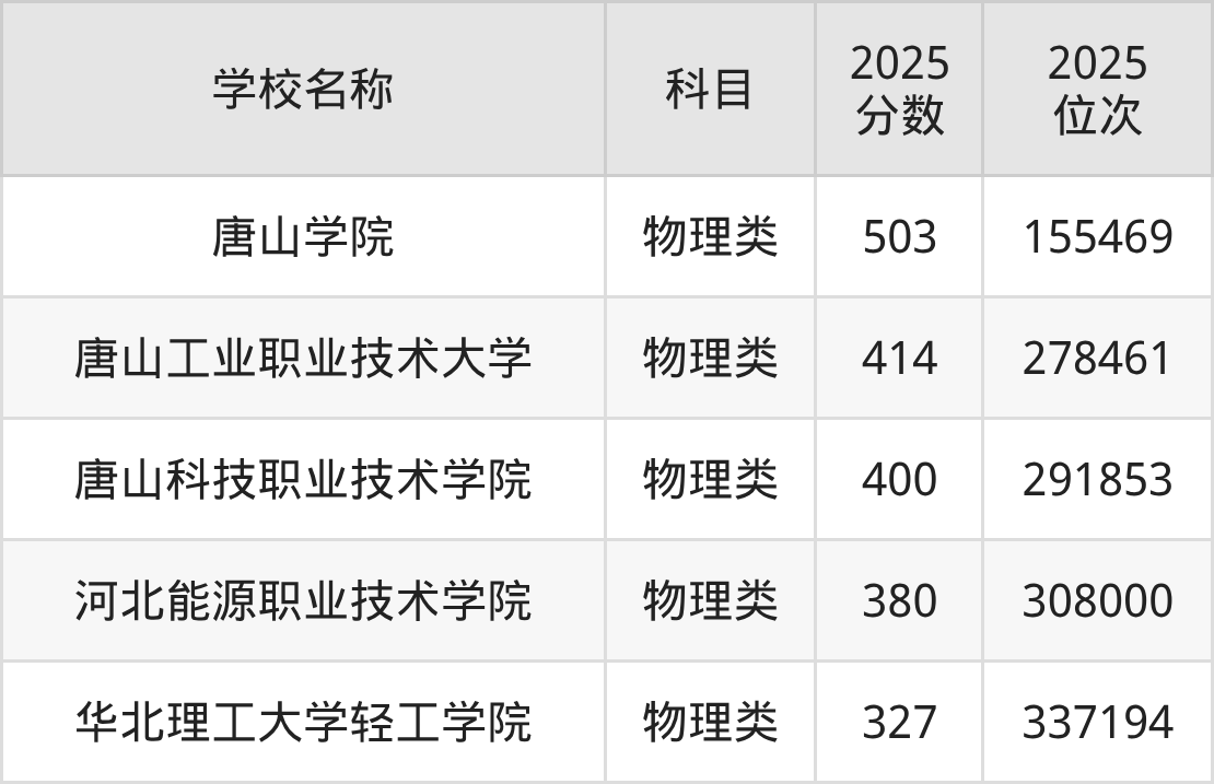 下文为2025年唐山市理工类大学在河北物理类录取分数线和位次排名表,供大家参考: