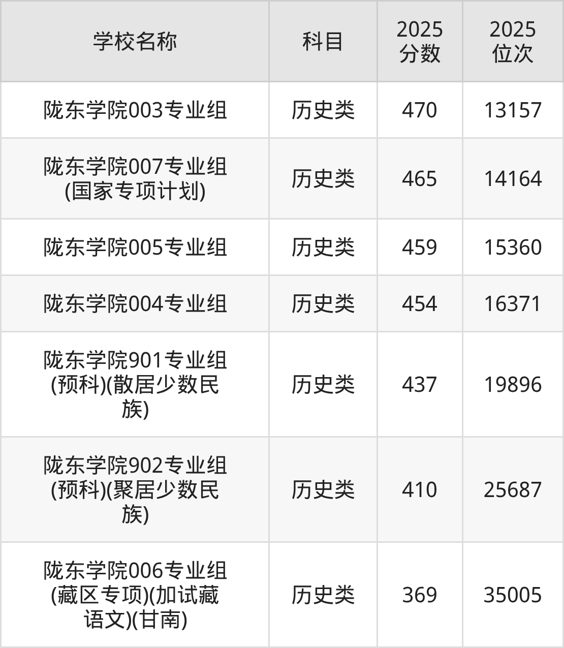 下文为2025年庆阳市本科大学在甘肃历史类录取分数线和位次排名表,供大家参考: