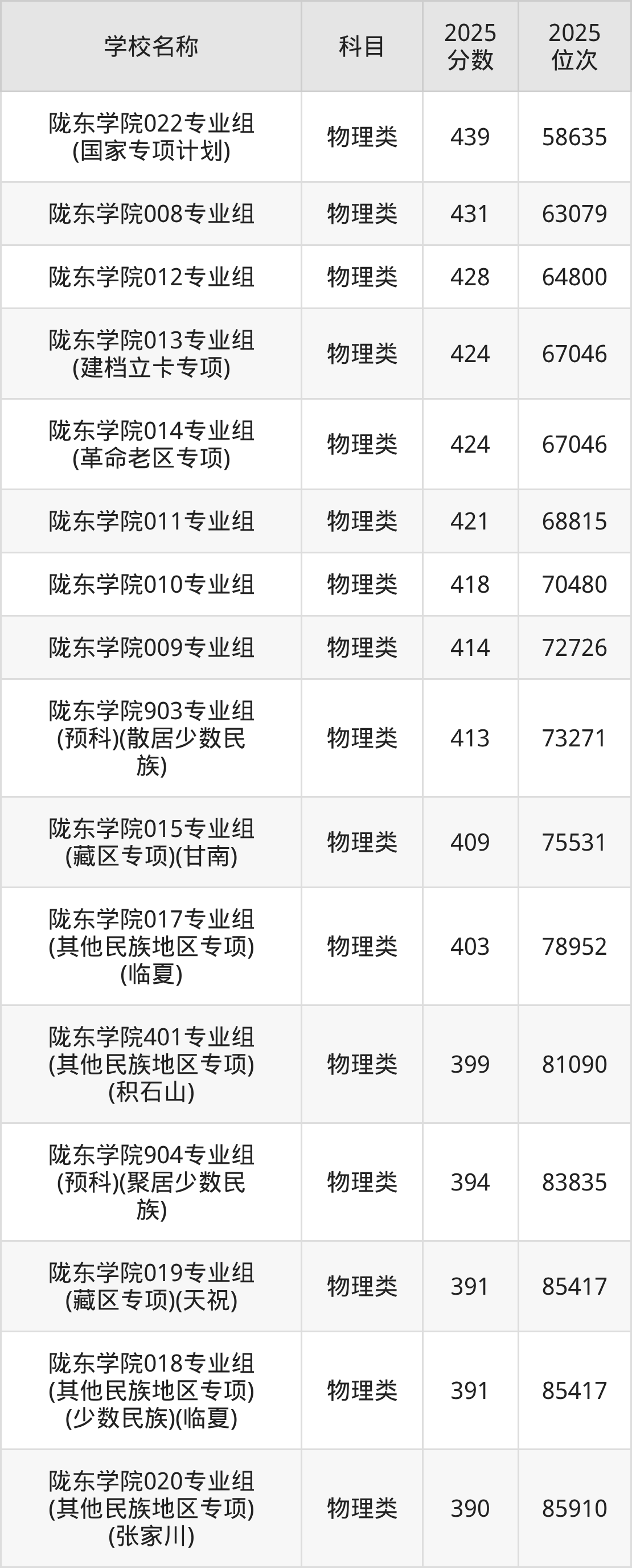 下文为2025年庆阳市本科大学在甘肃物理类录取分数线和位次排名表,供大家参考:
