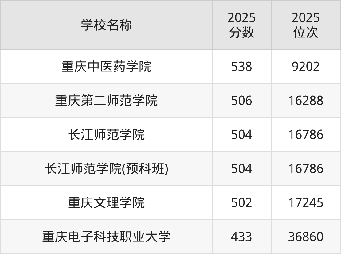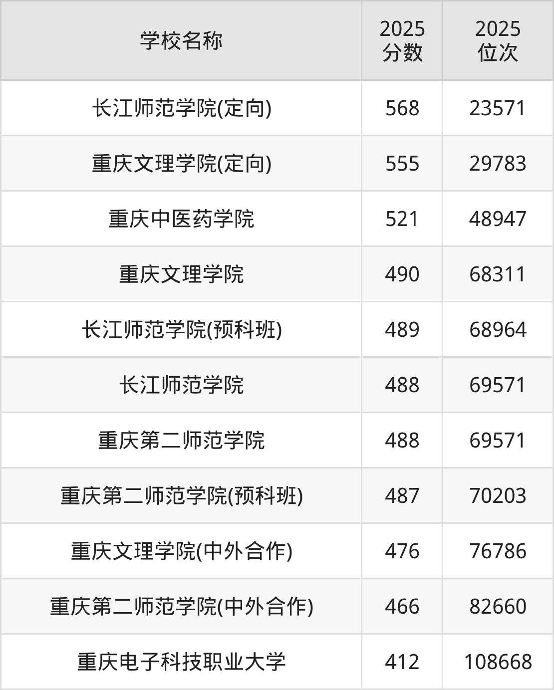 下文为2025年重庆市公办二本大学在重庆历史类录取分数线和位次排名表,供大家参考: