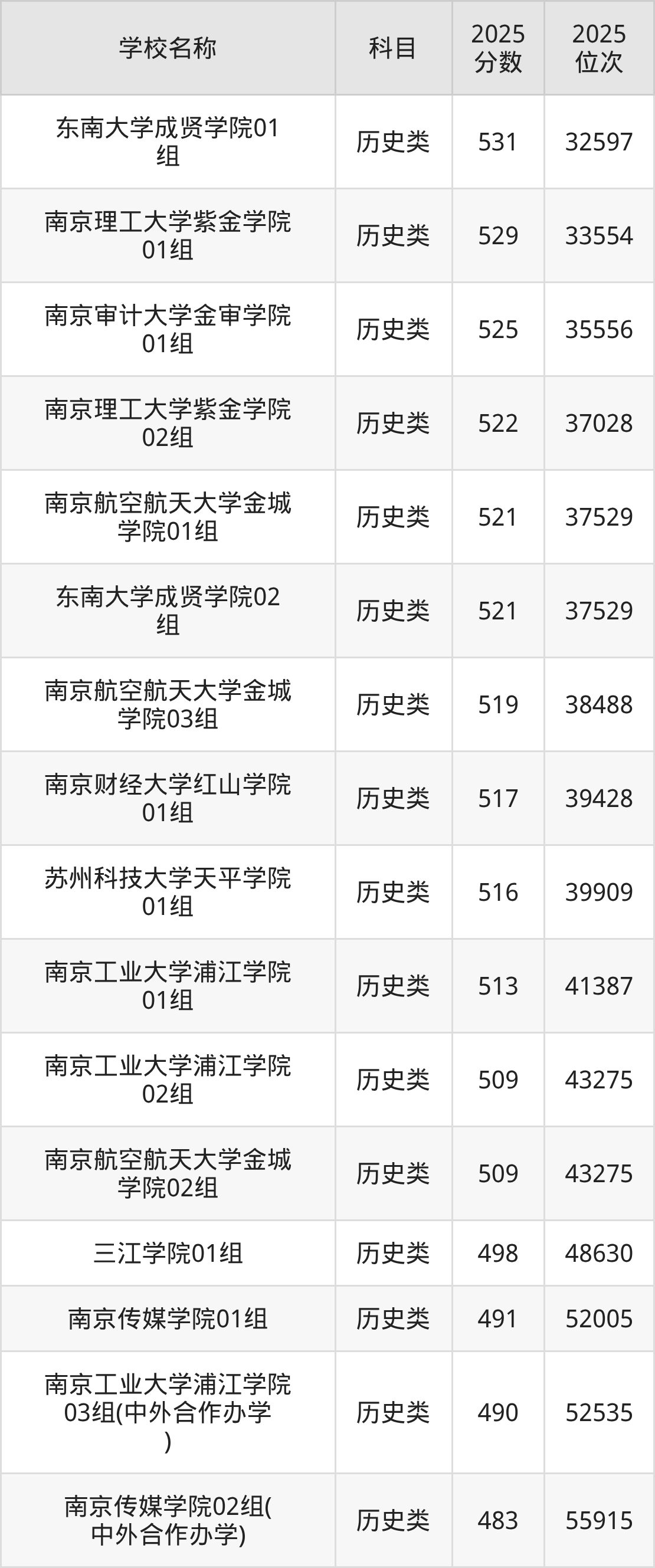 下文为2025年南京市民办二本大学在江苏历史类录取分数线和位次排名表,供大家参考: