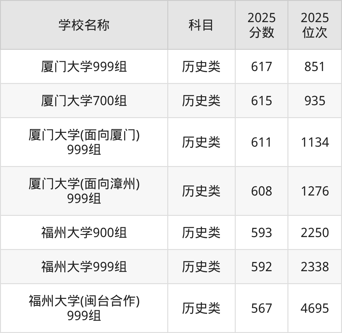 下文为2025年福建省双一流大学在福建历史类录取分数线和位次排名表,供大家参考: