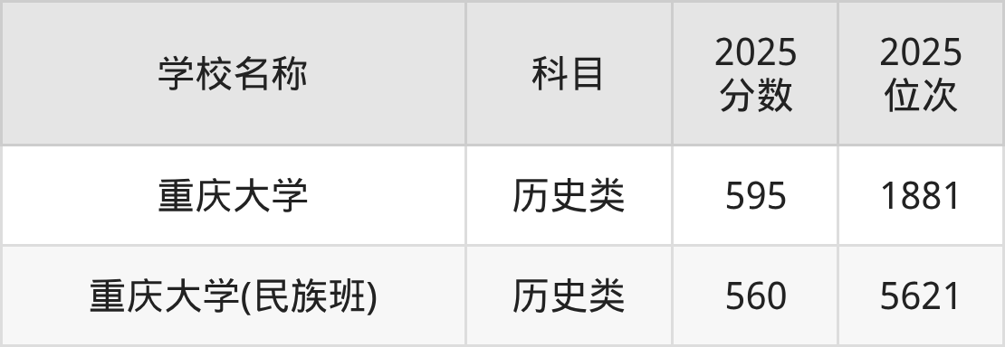 下文为2025年重庆市985大学在重庆历史类录取分数线和位次排名表,供大家参考: