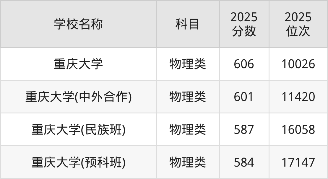 下文为2025年重庆市985大学在重庆物理类录取分数线和位次排名表,供大家参考: