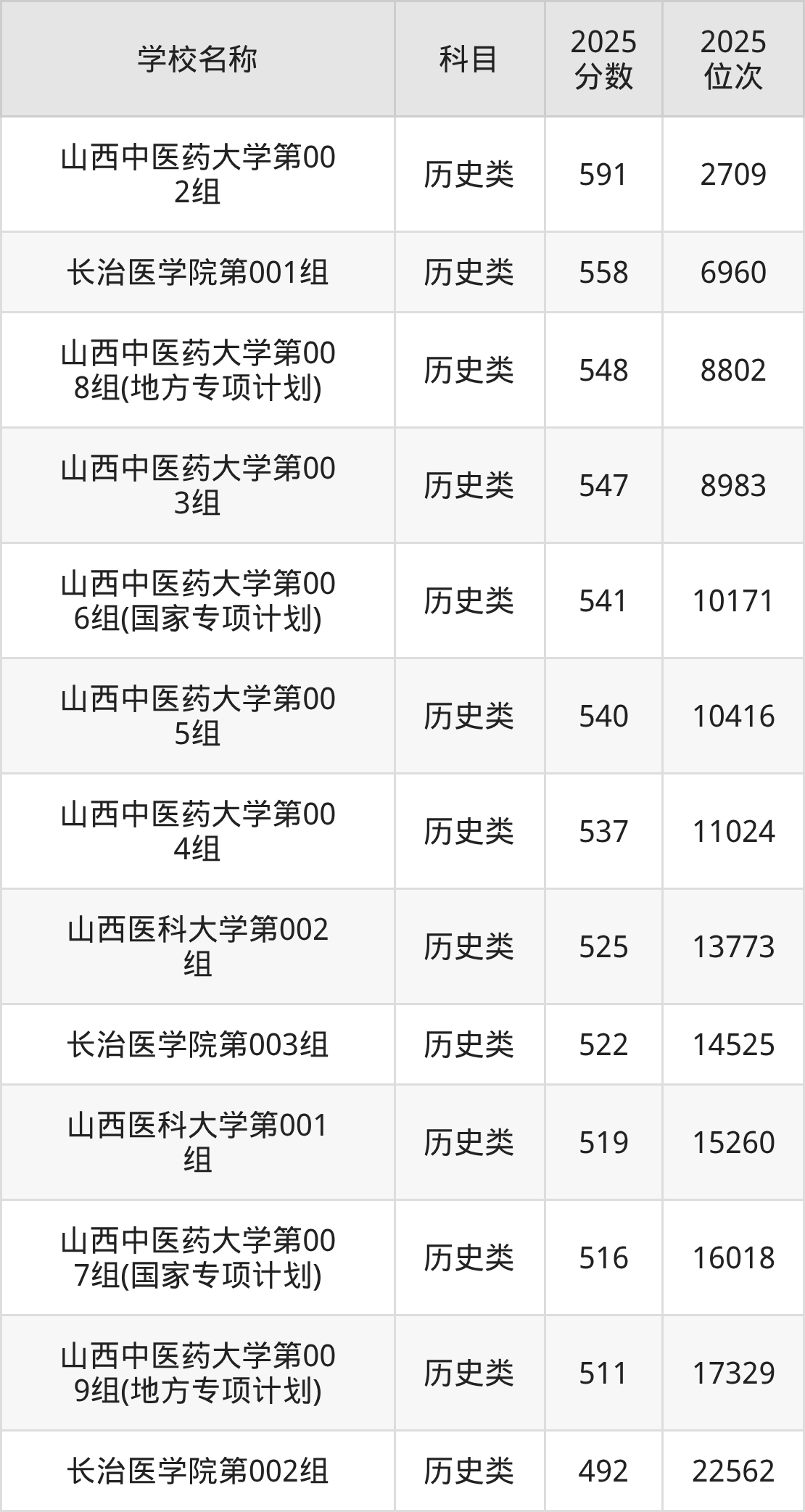 下文为2025年山西省医科大学在山西历史类录取分数线和位次排名表,供大家参考: