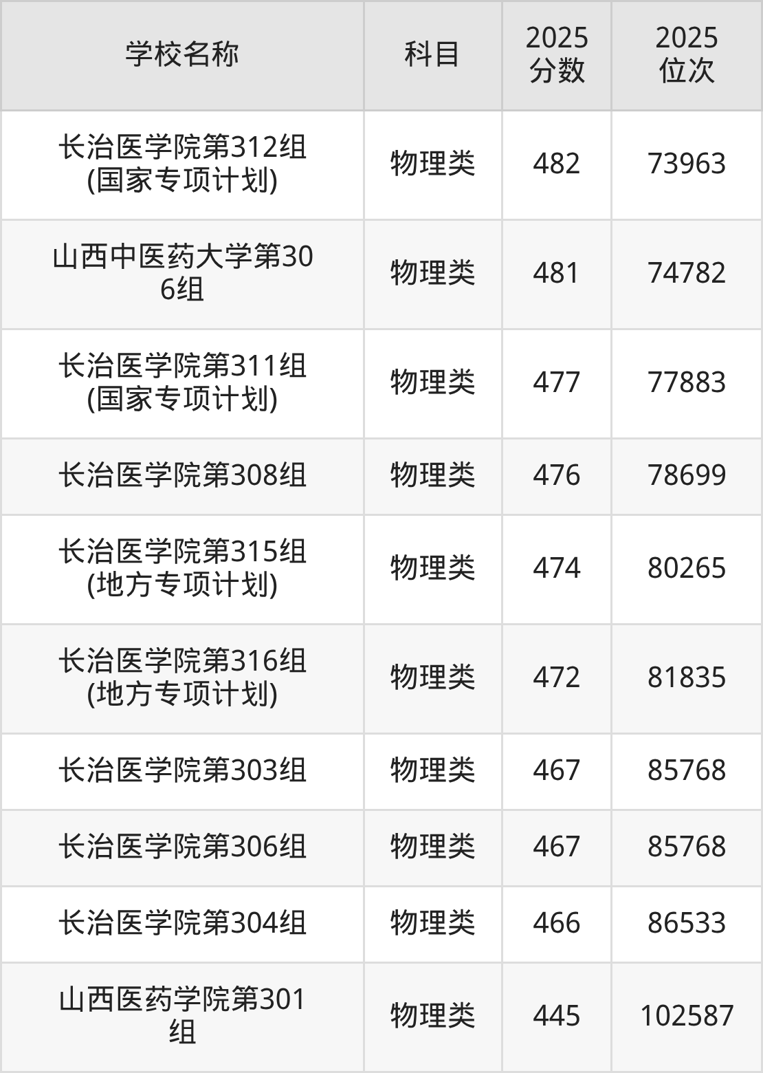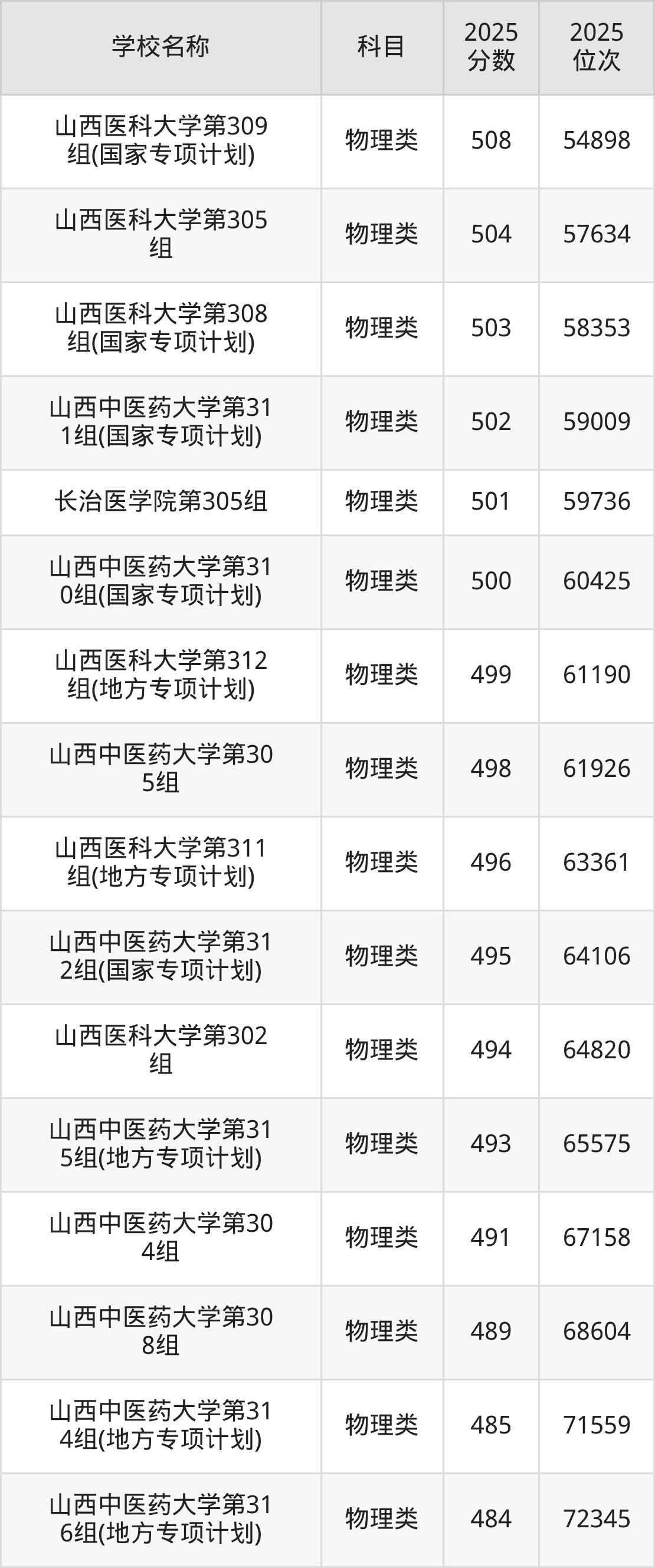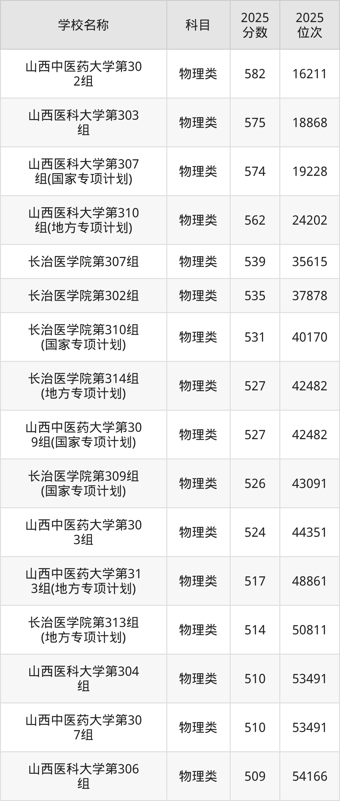 下文为2025年山西省医科大学在山西物理类录取分数线和位次排名表,供大家参考: