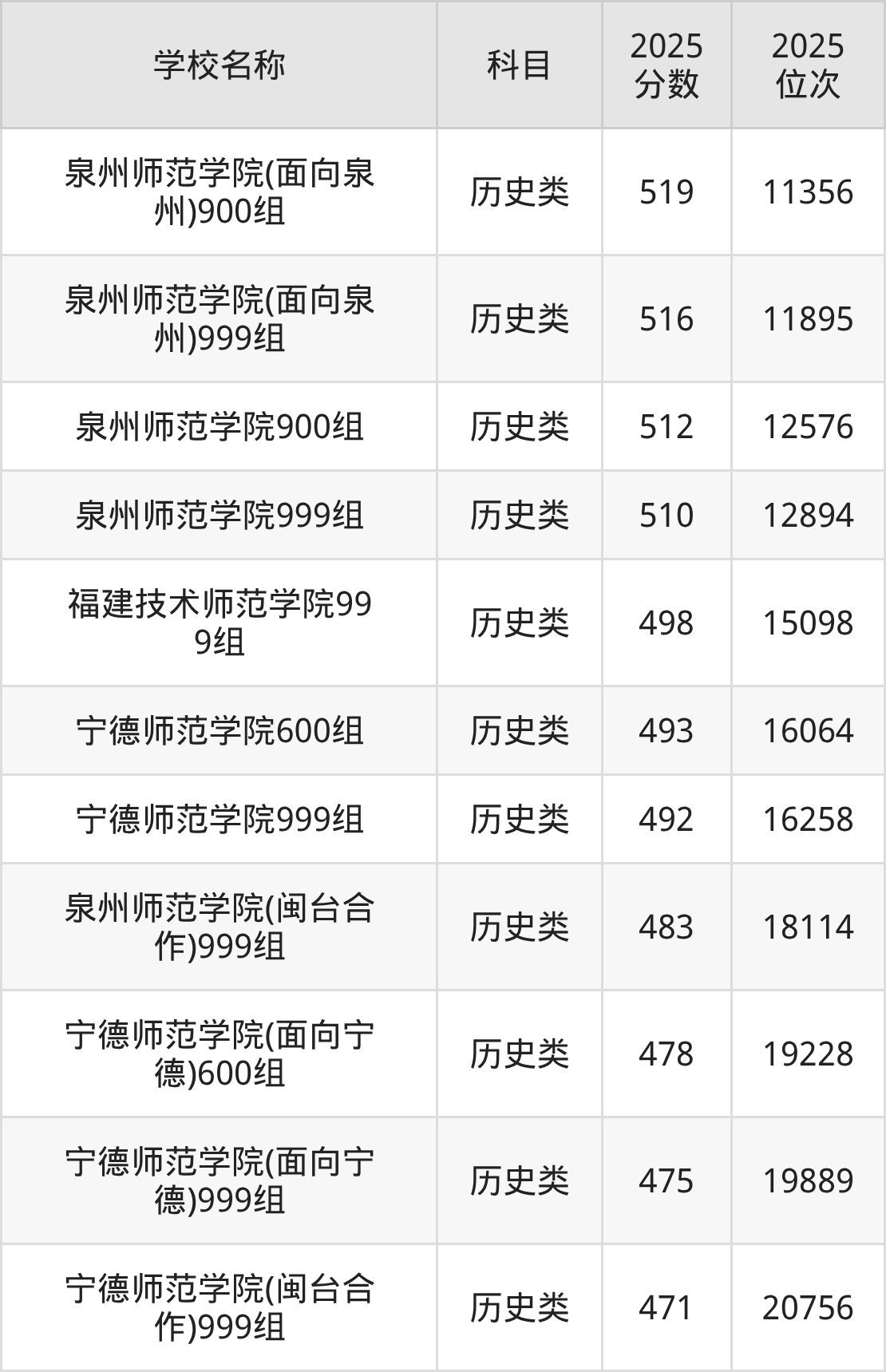 下文为2025年福建省二本师范大学在福建历史类录取分数线和位次排名表,供大家参考: