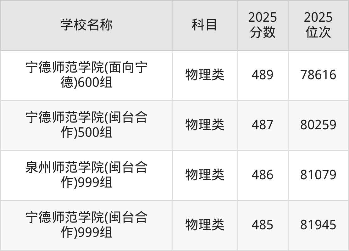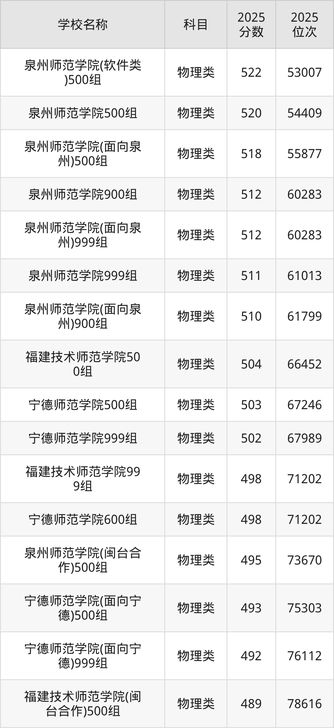 下文为2025年福建省二本师范大学在福建物理类录取分数线和位次排名表,供大家参考: