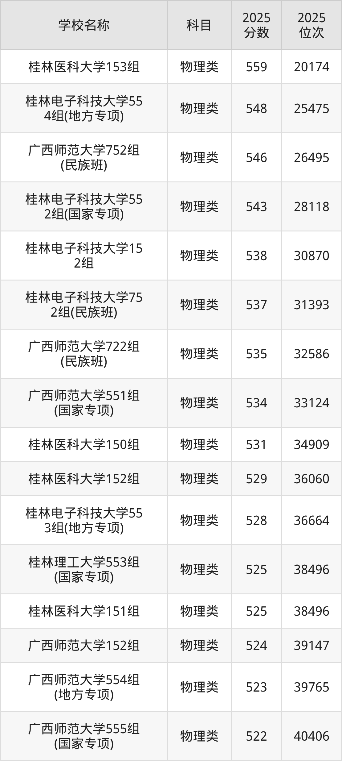 下文为2025年桂林市含保研资格的大学在广西物理类录取分数线和位次排名表,供大家参考: