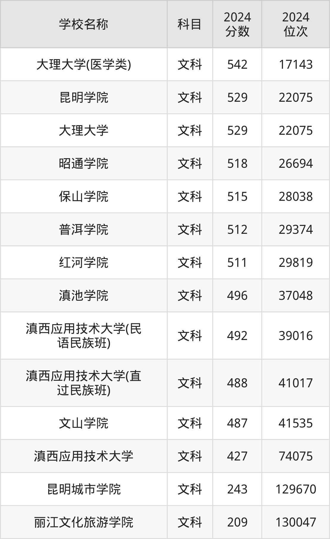 下文为2024年云南省二本综合大学在云南文科录取分数线和位次排名表,供大家参考: