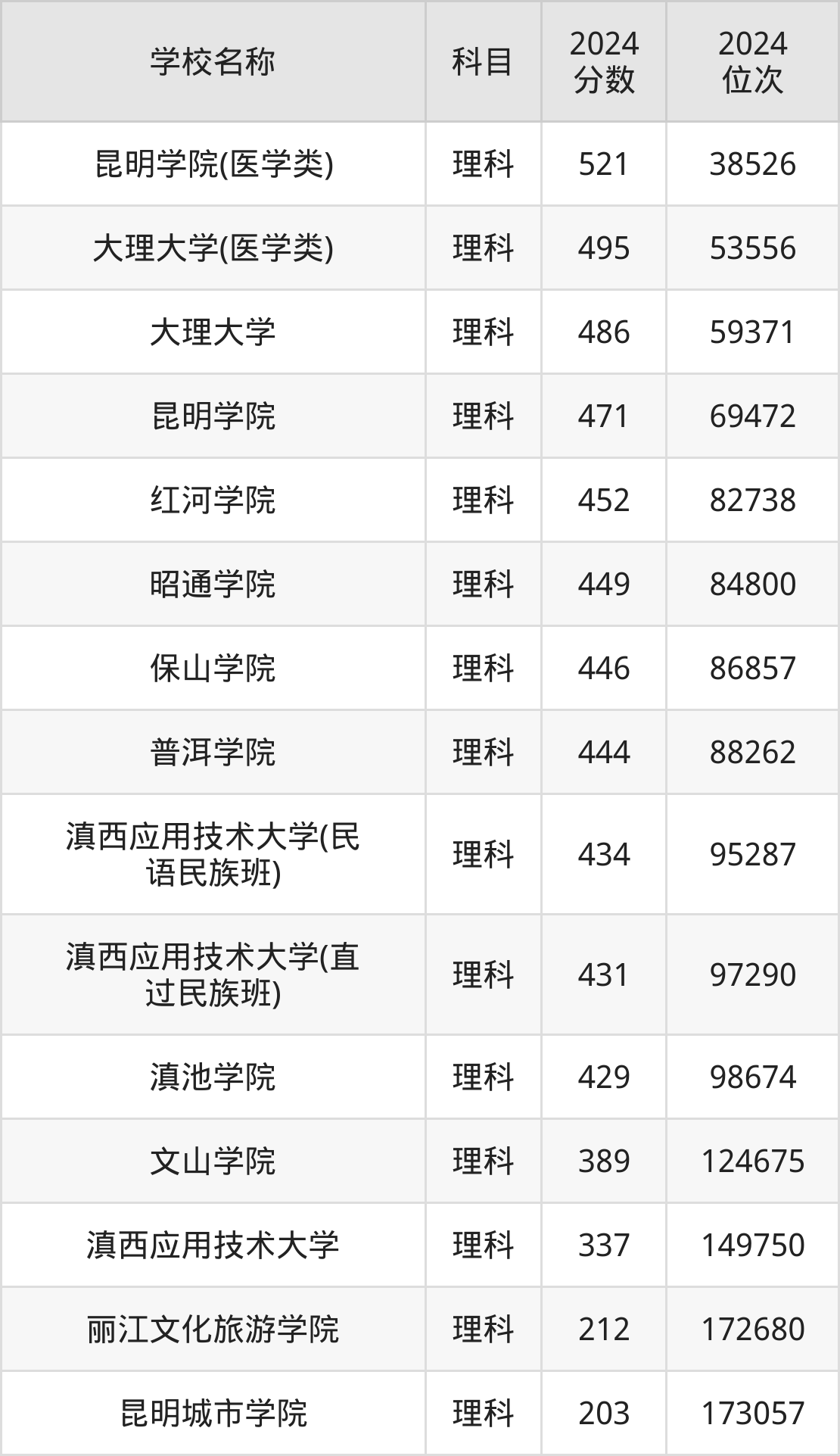 下文为2024年云南省二本综合大学在云南理科录取分数线和位次排名表,供大家参考: