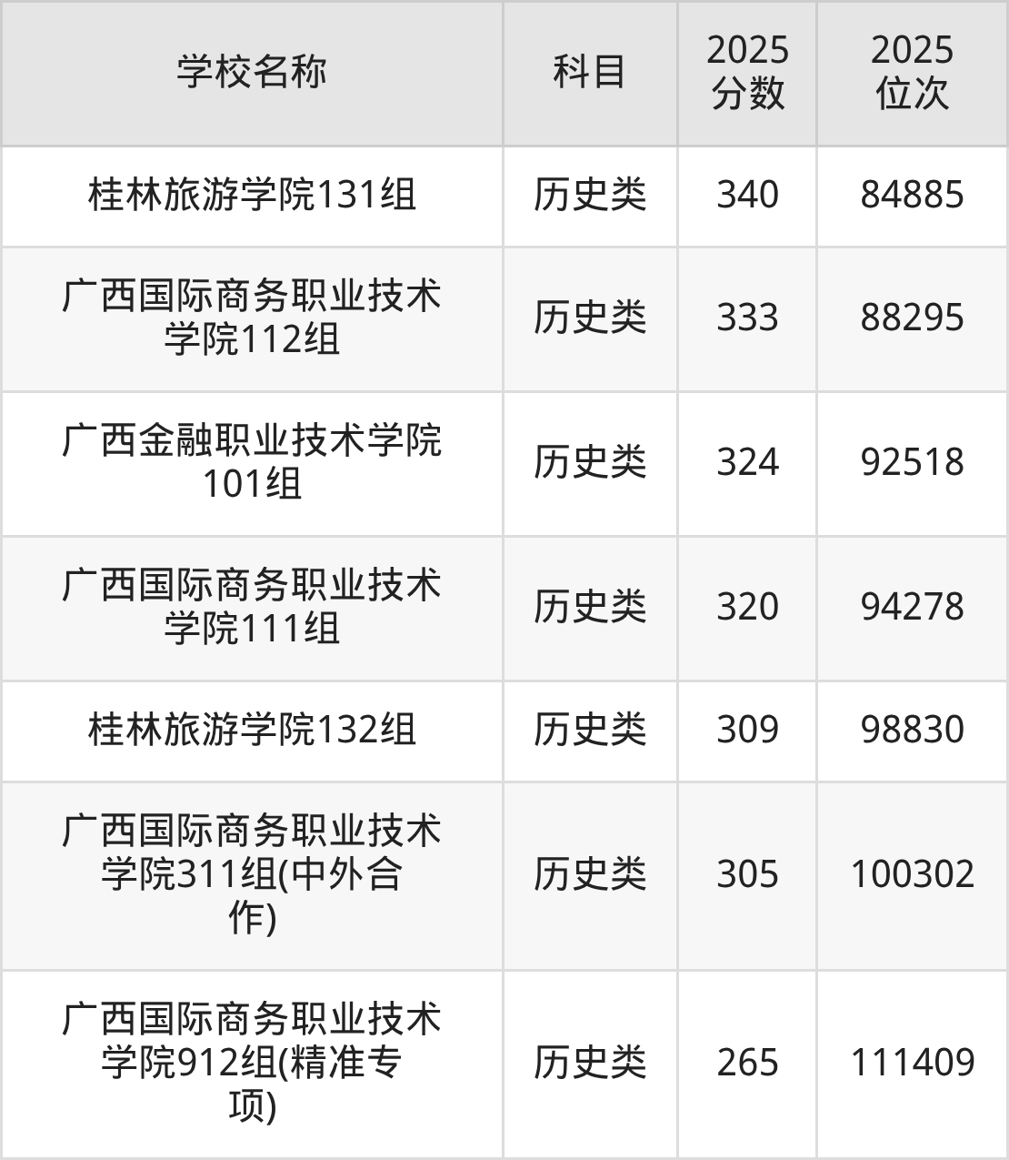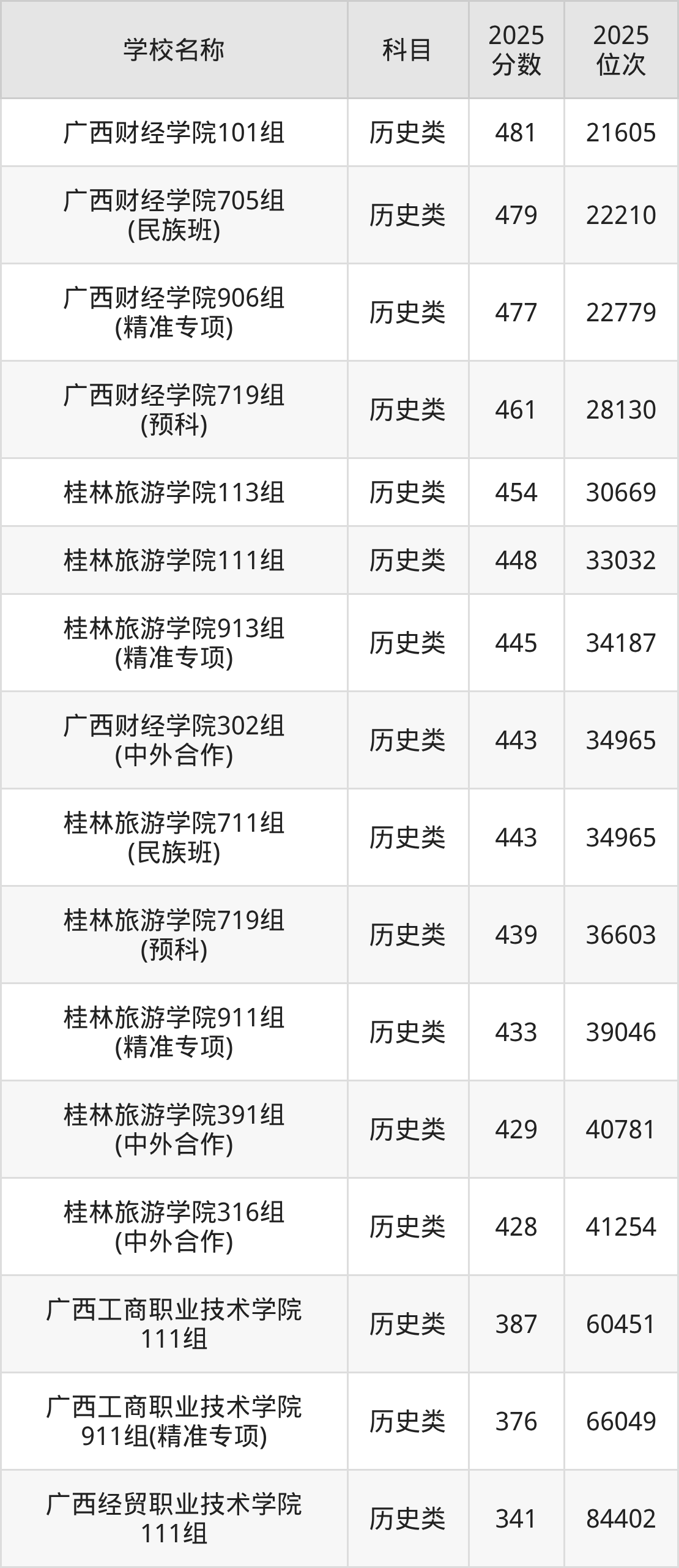 下文为2025年广西壮族自治区财经类大学在广西历史类录取分数线和位次排名表,供大家参考: