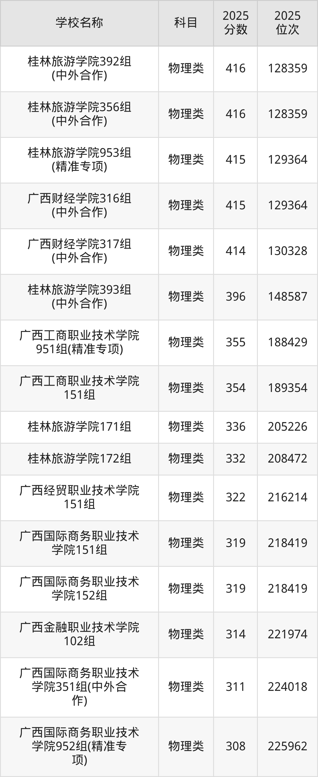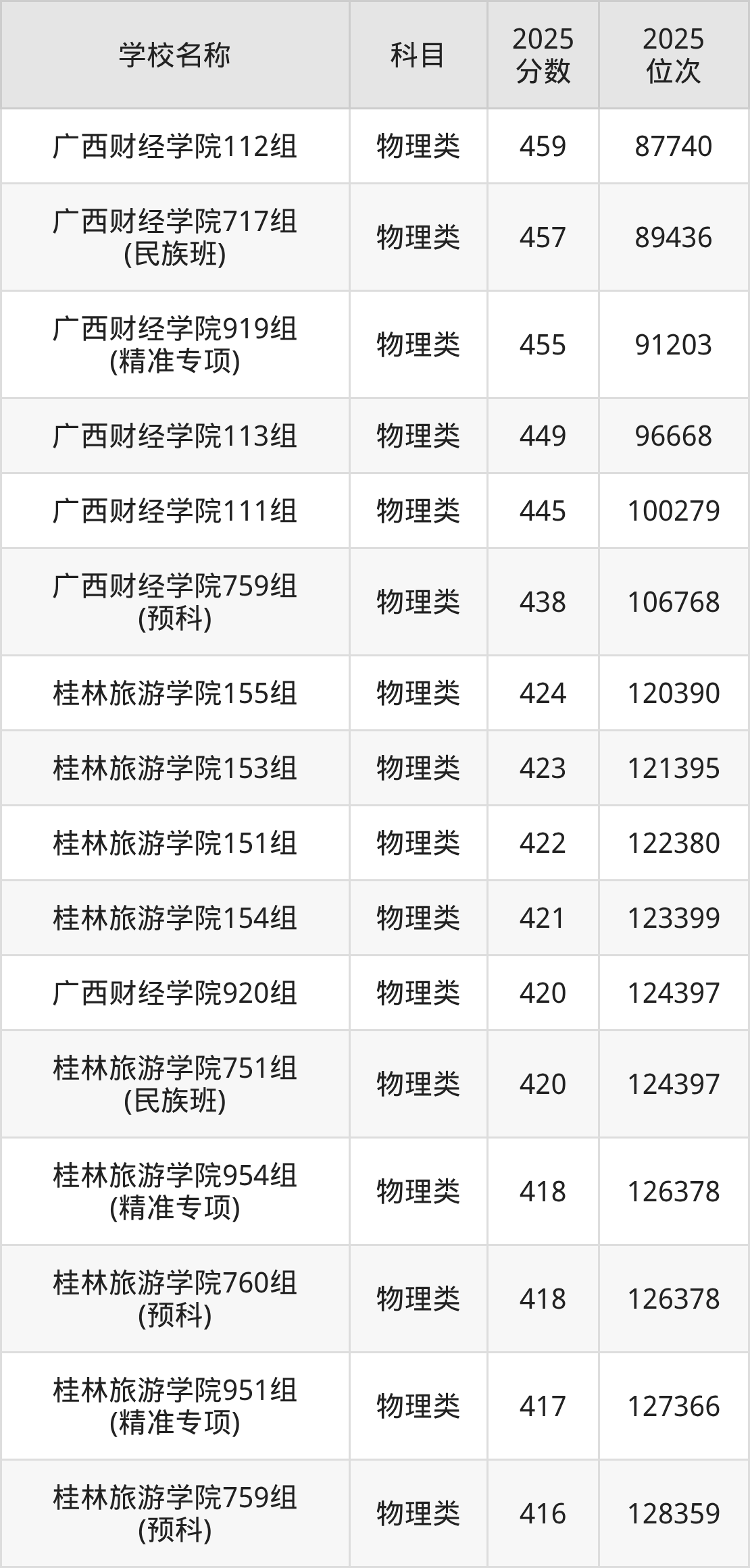 下文为2025年广西壮族自治区财经类大学在广西物理类录取分数线和位次排名表,供大家参考: