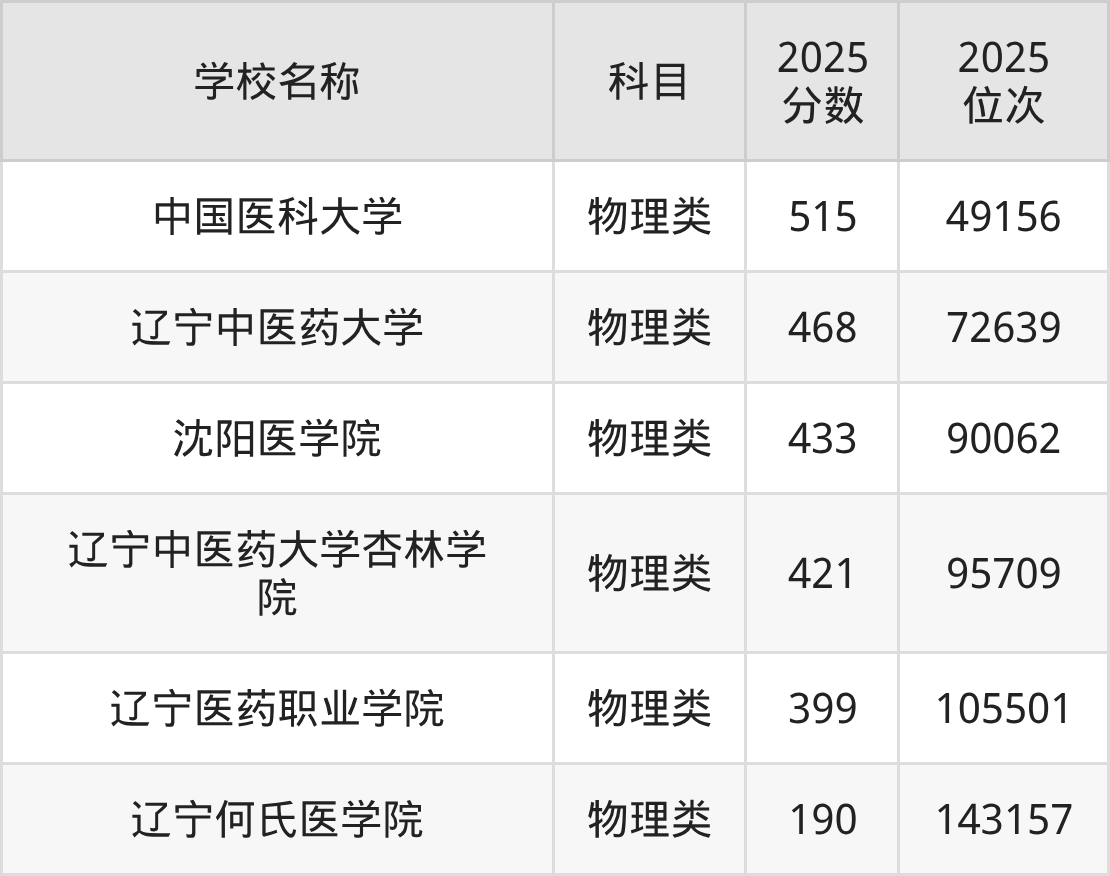 下文为2025年沈阳市医科大学在辽宁物理类录取分数线和位次排名表,供大家参考: