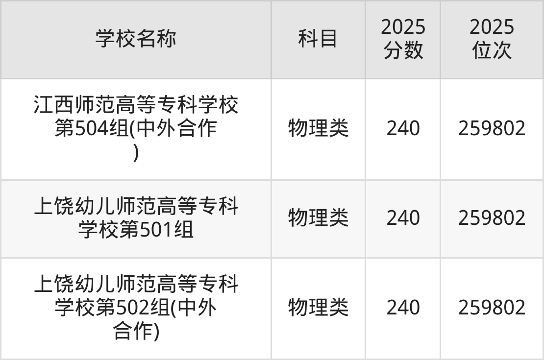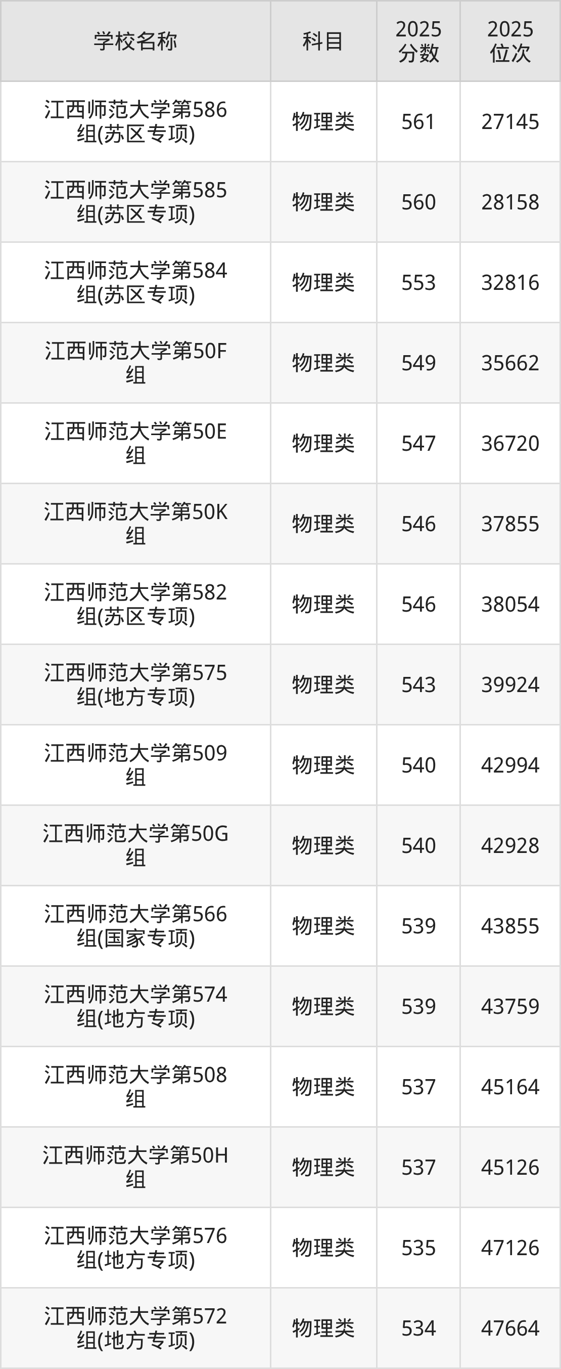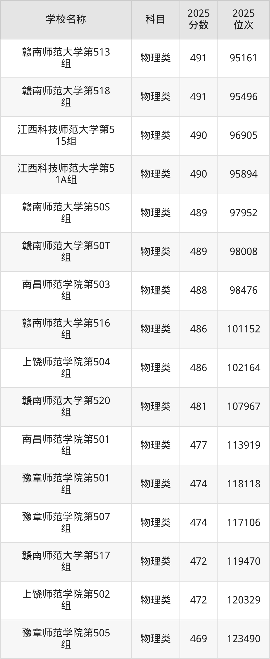 下文为2025年江西省师范类大学在江西物理类录取分数线和位次排名表,供大家参考: