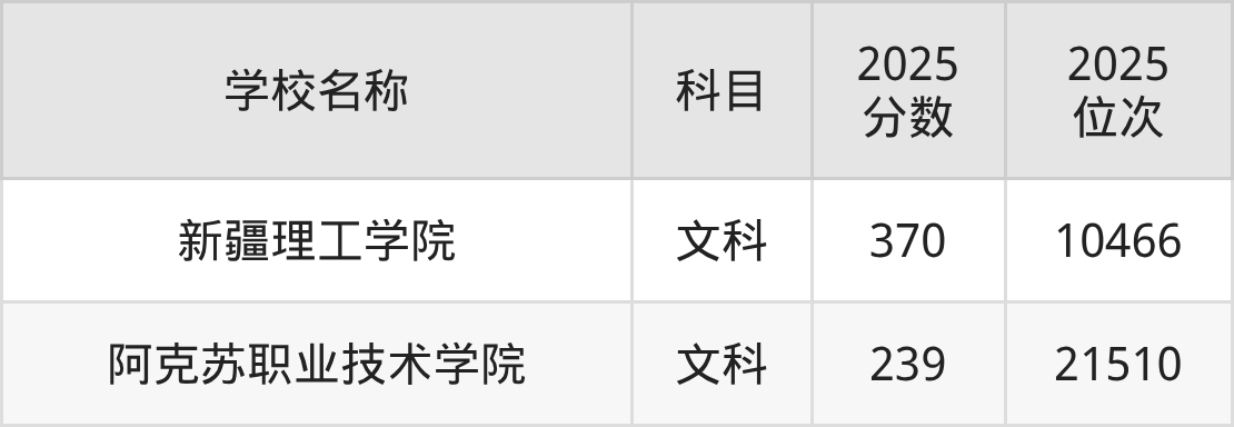 下文为2025年阿克苏地区市综合类大学在新疆文科录取分数线和位次排名表,供大家参考:
