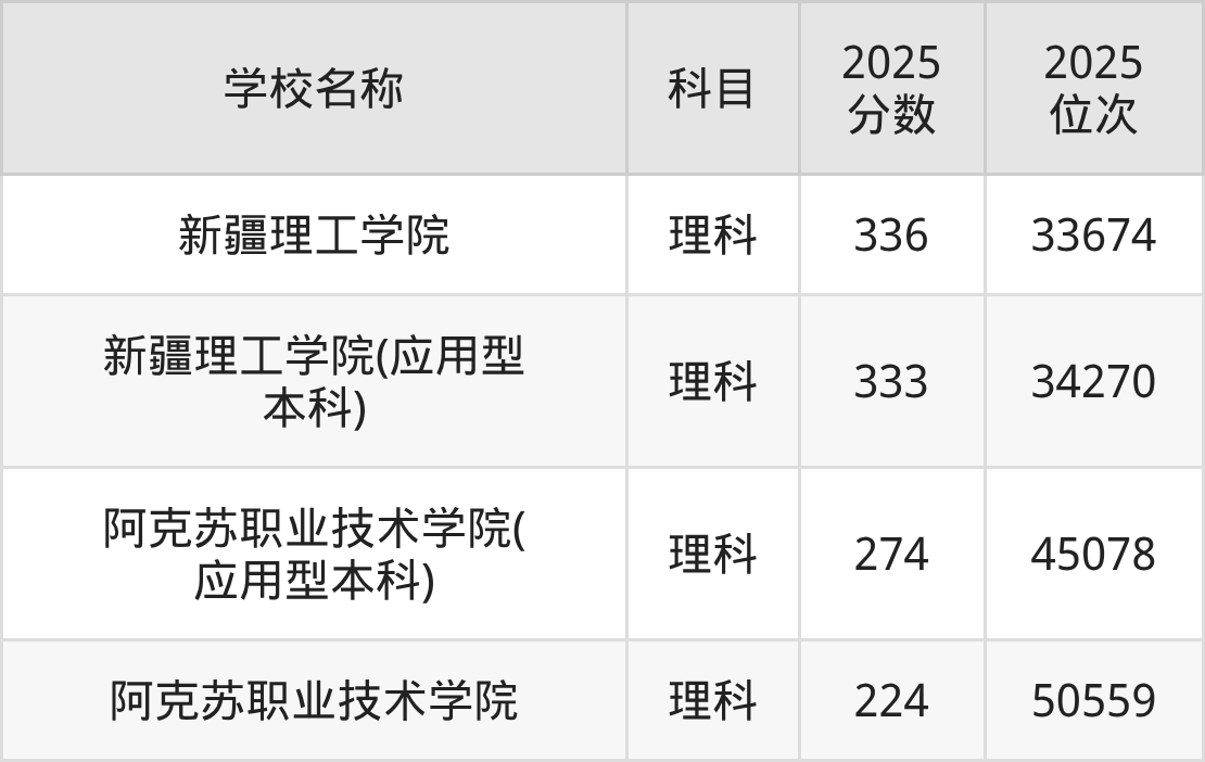 下文为2025年阿克苏地区市综合类大学在新疆理科录取分数线和位次排名表,供大家参考: