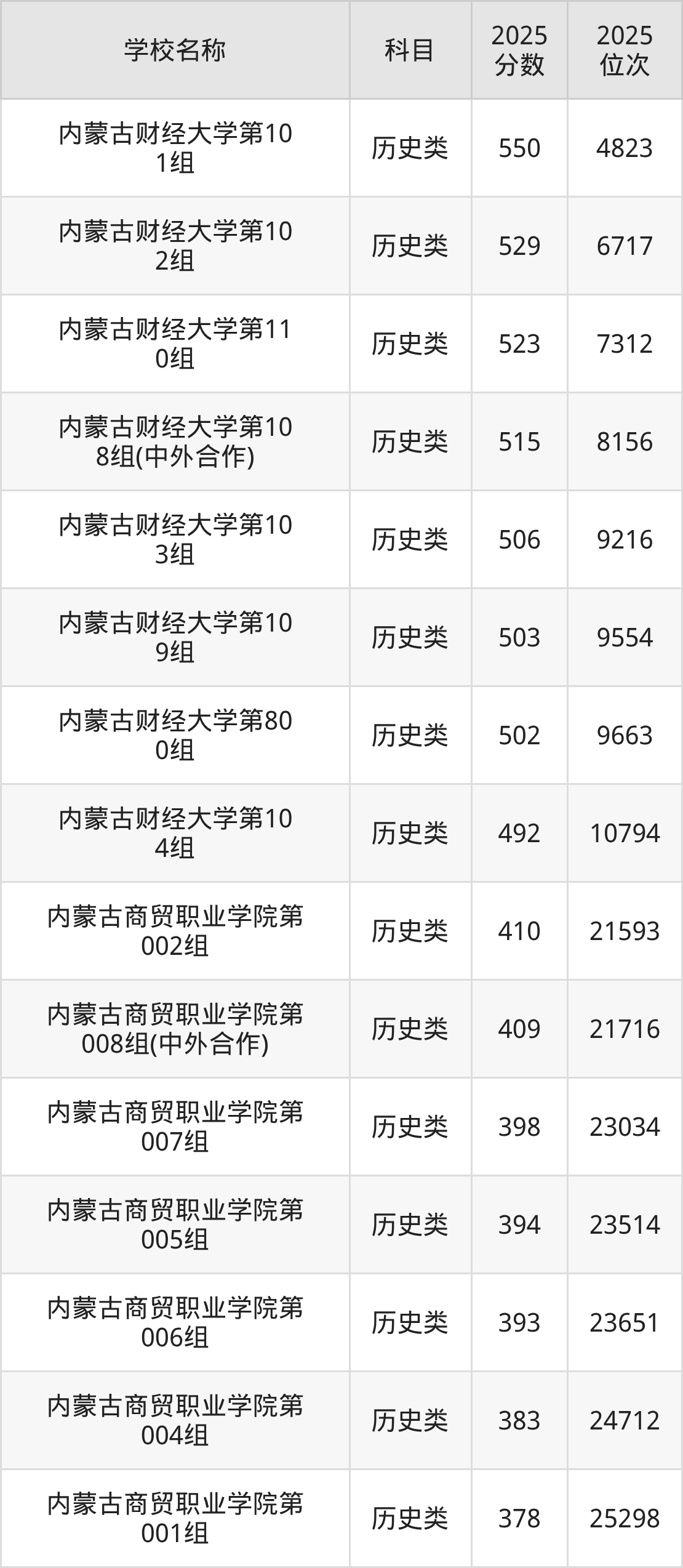 下文为2025年内蒙古自治区财经类大学在内蒙古历史类录取分数线和位次排名表,供大家参考: