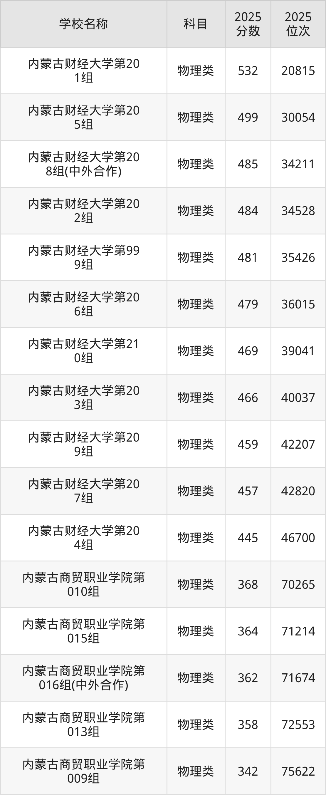 下文为2025年内蒙古自治区财经类大学在内蒙古物理类录取分数线和位次排名表,供大家参考:
