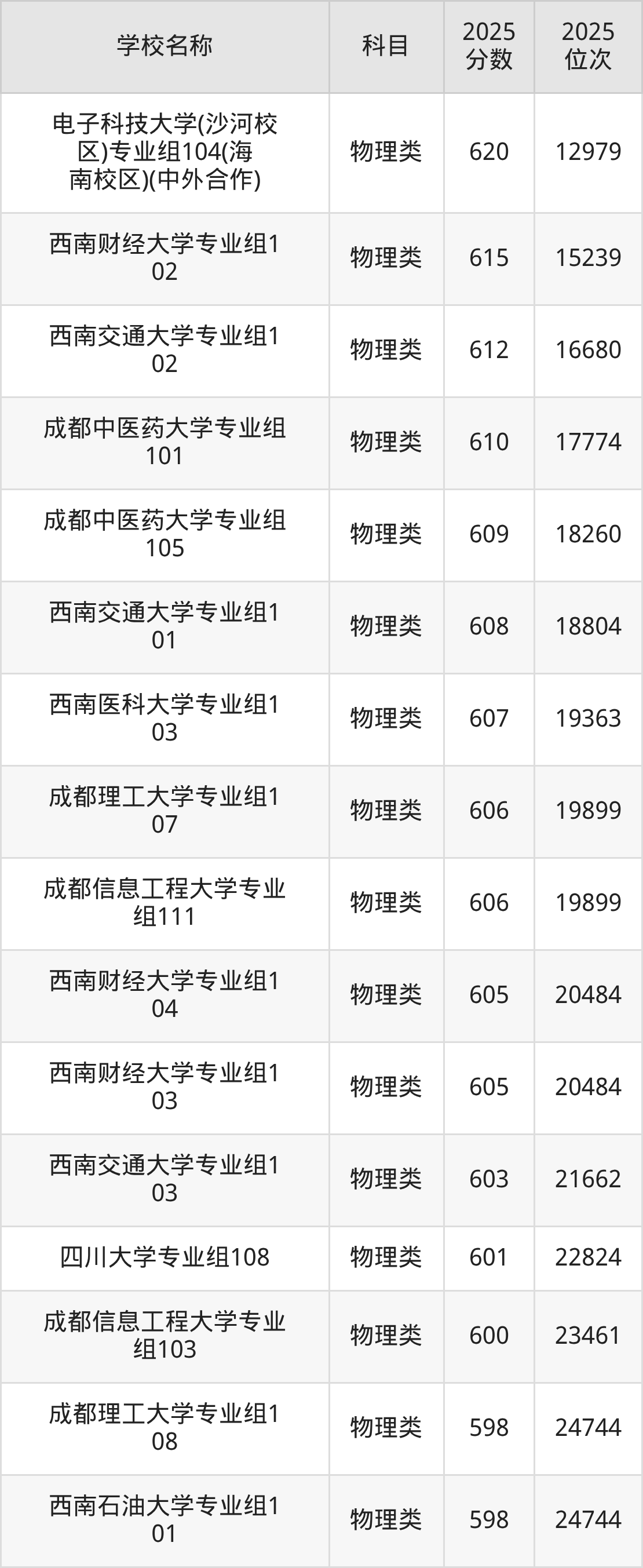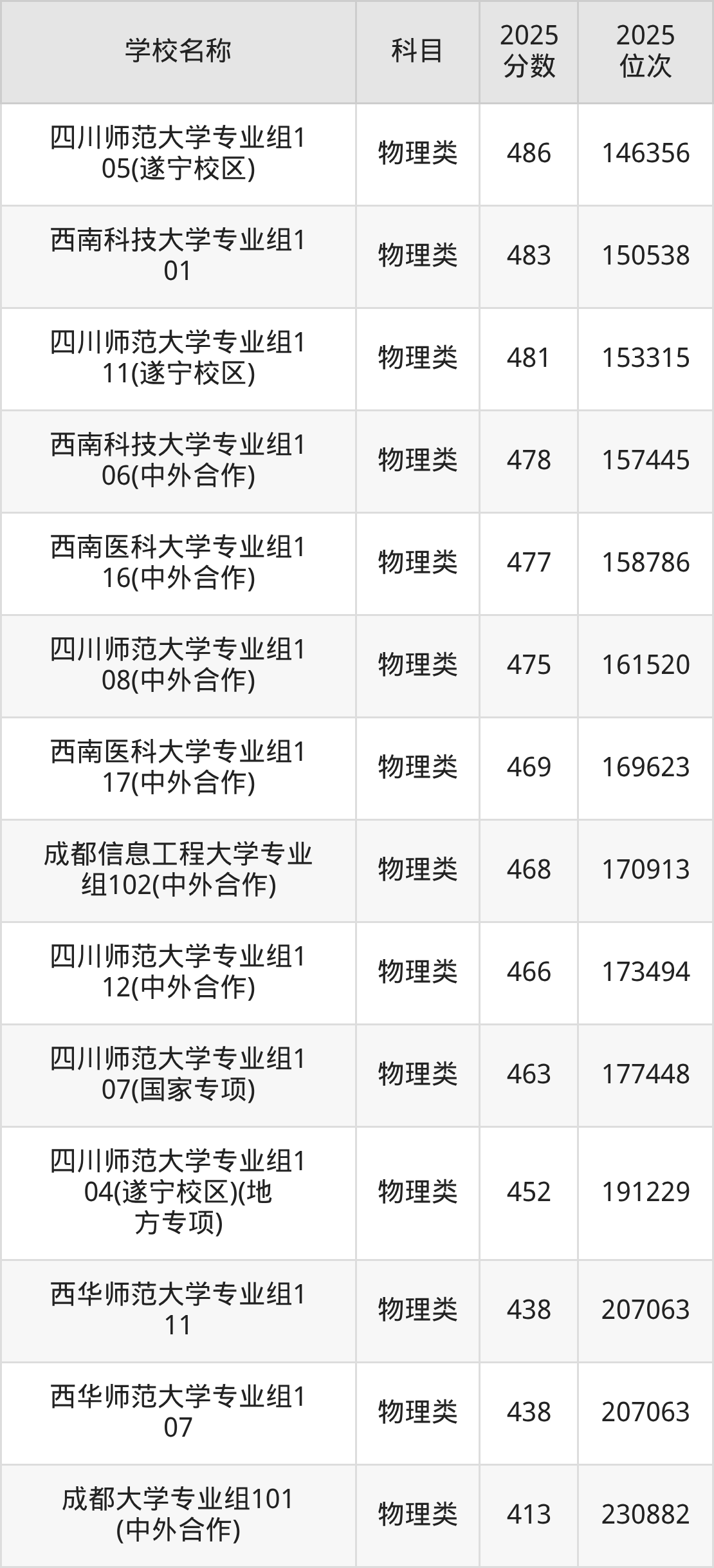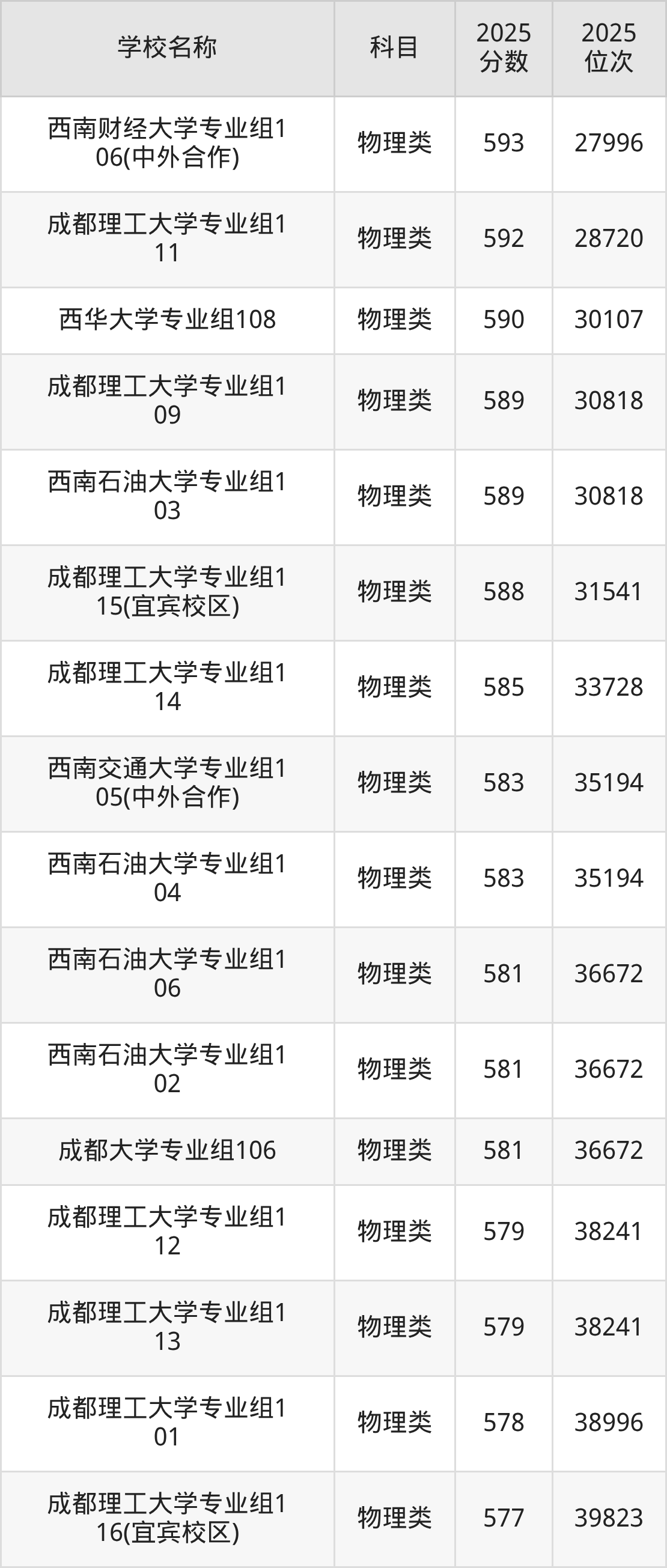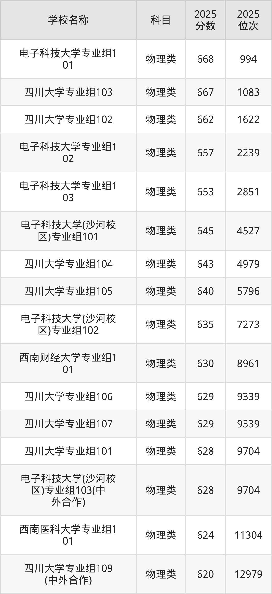 下文为2025年四川省一本大学在四川物理类录取分数线和位次排名表,供大家参考: