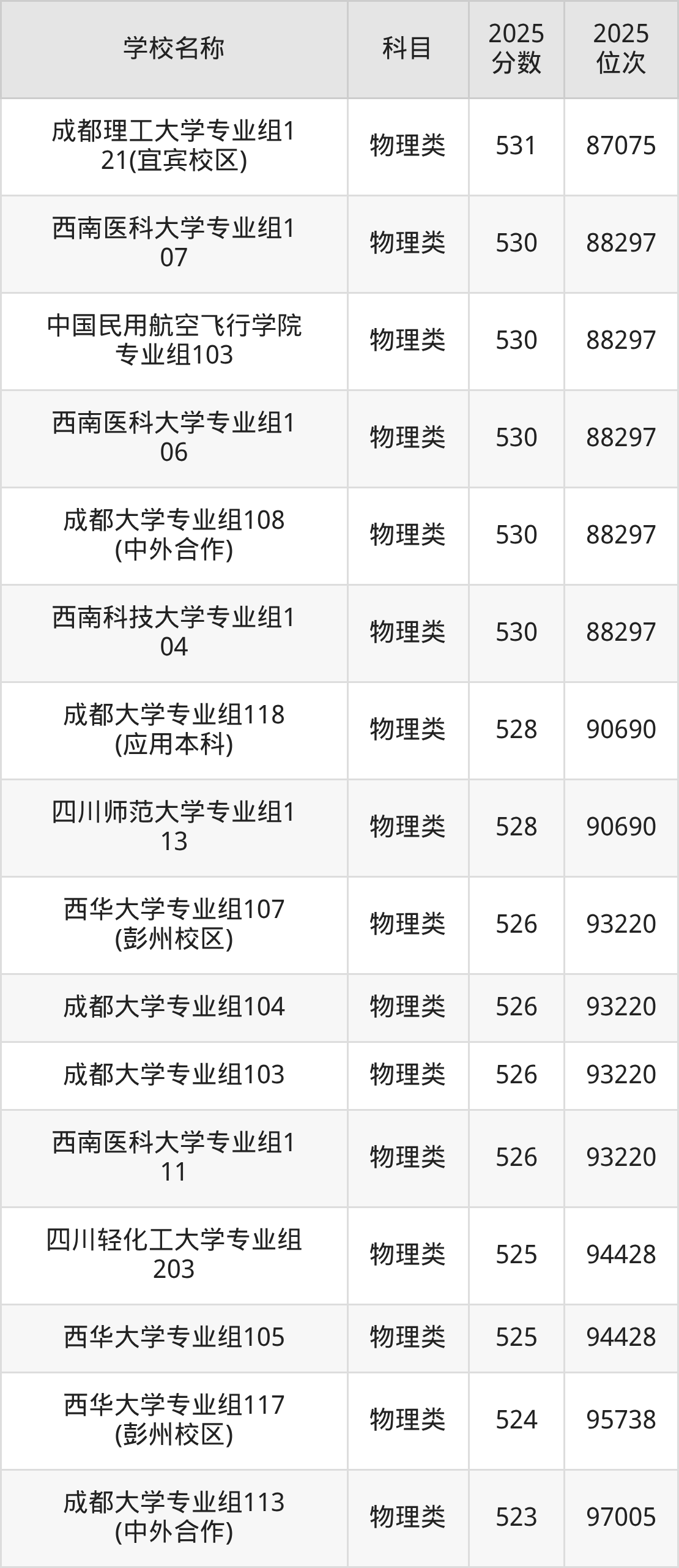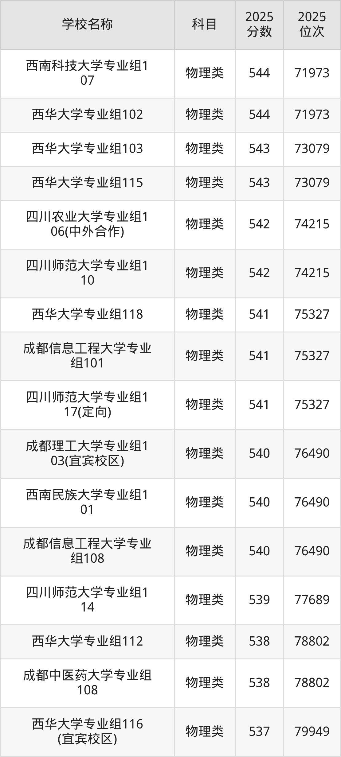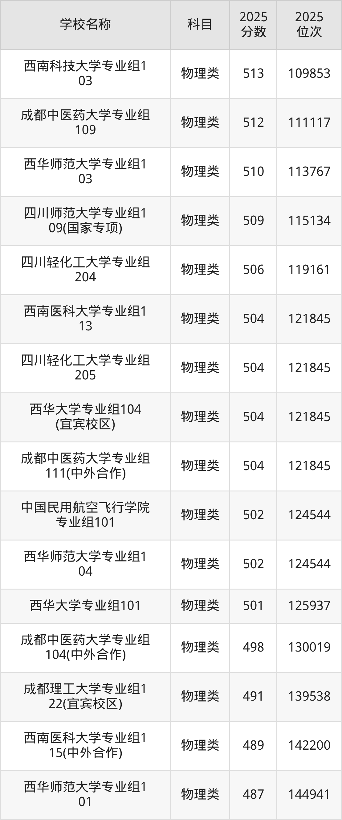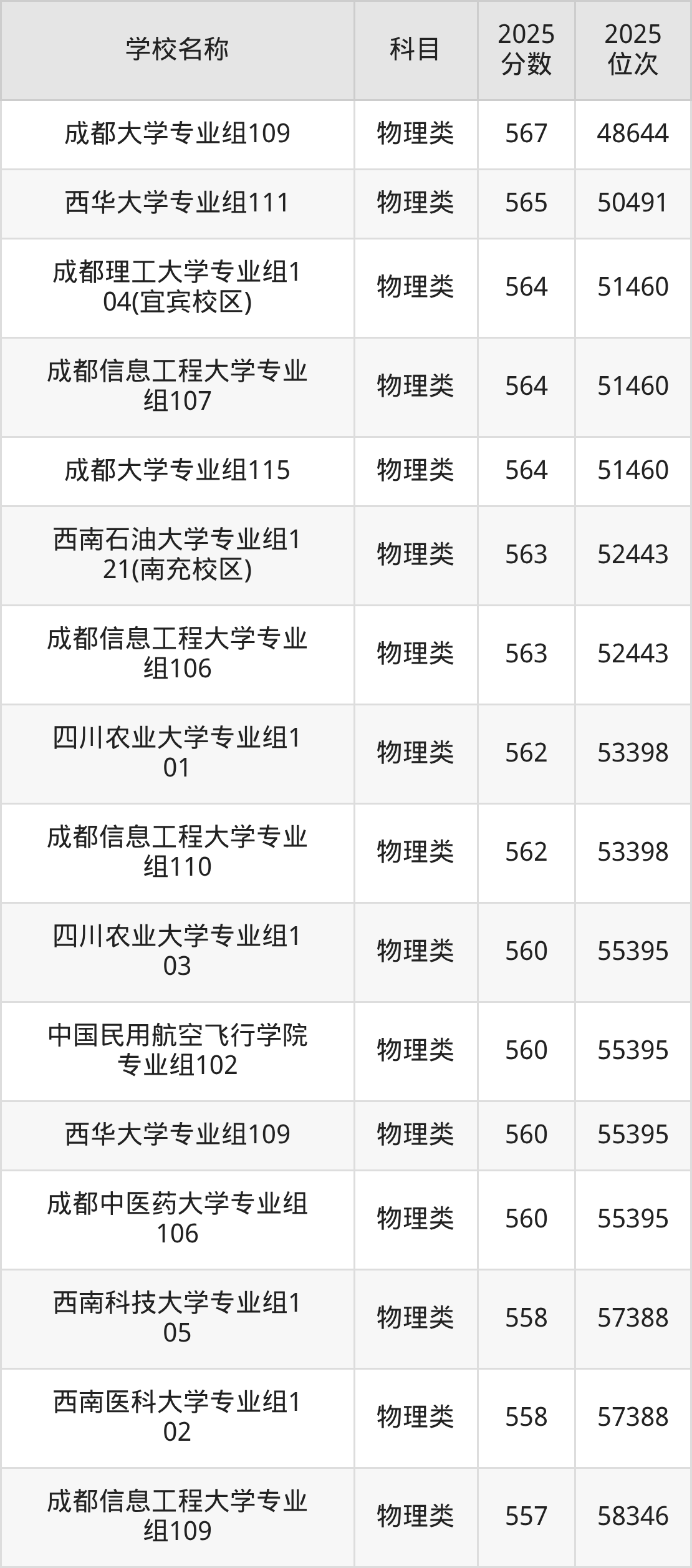 下文为2025年四川省一本大学在四川物理类录取分数线和位次排名表,供大家参考: