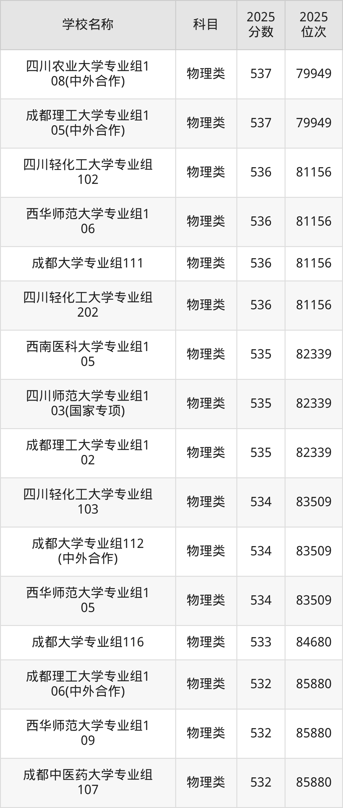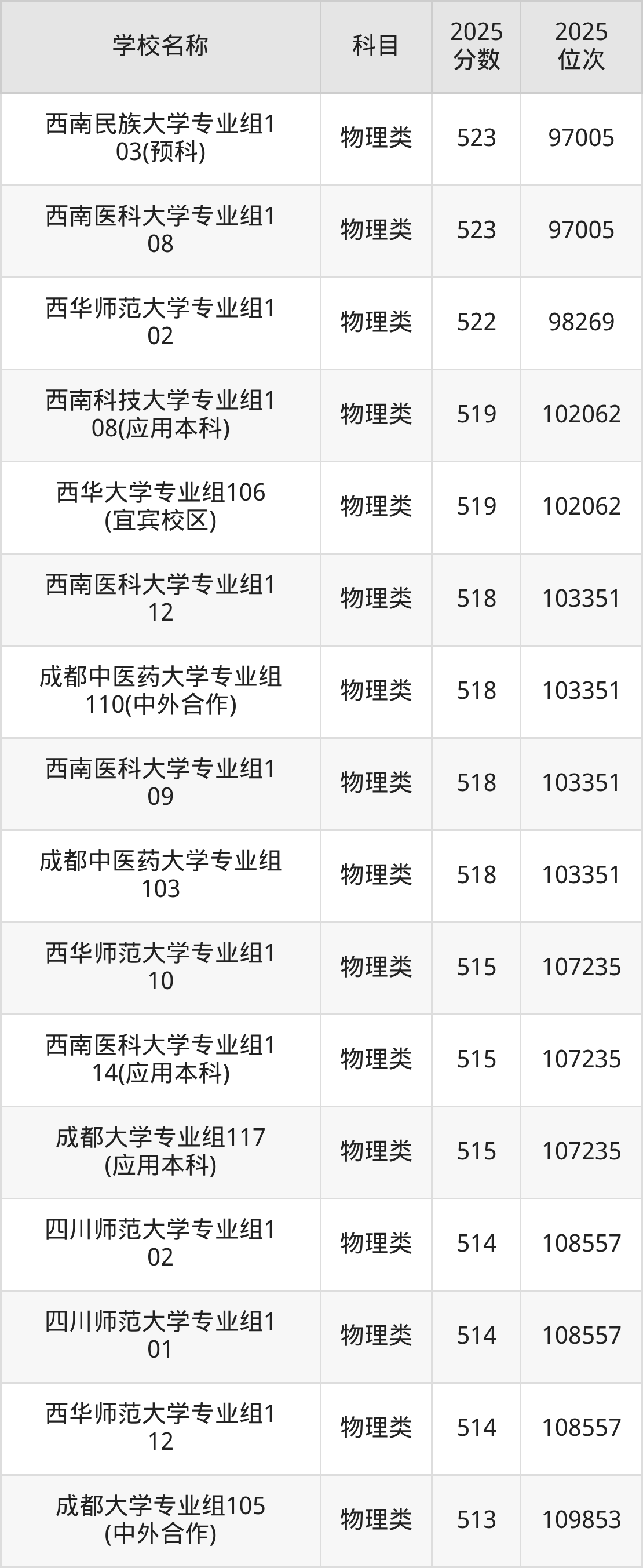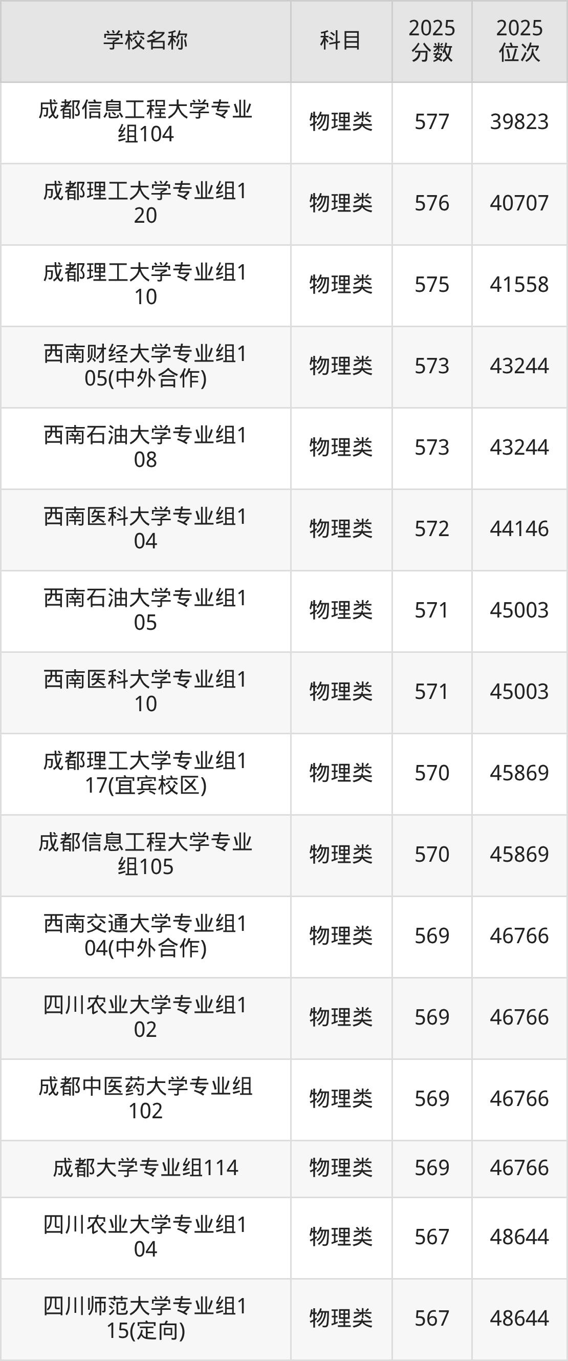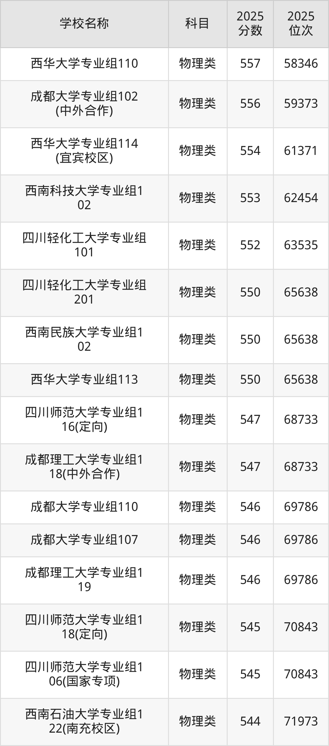 下文为2025年四川省一本大学在四川物理类录取分数线和位次排名表,供大家参考: