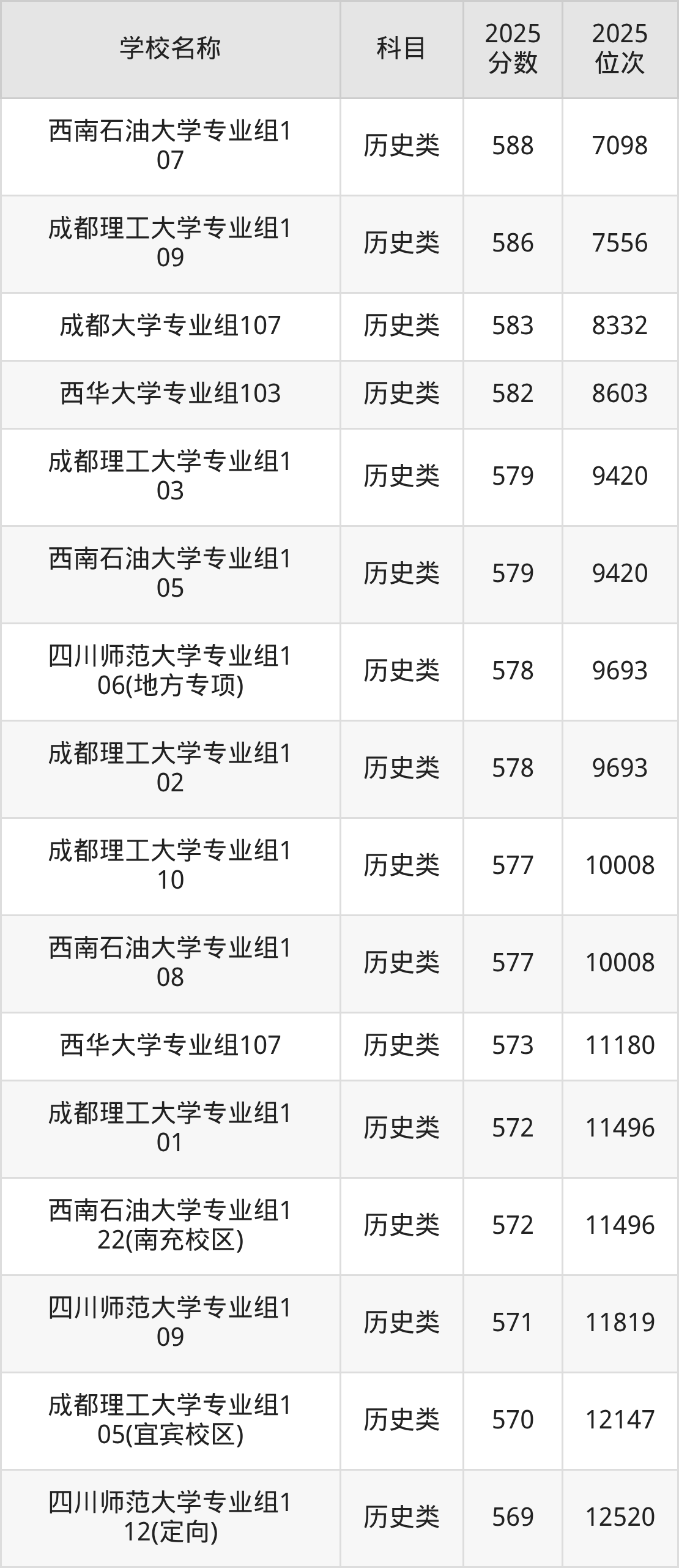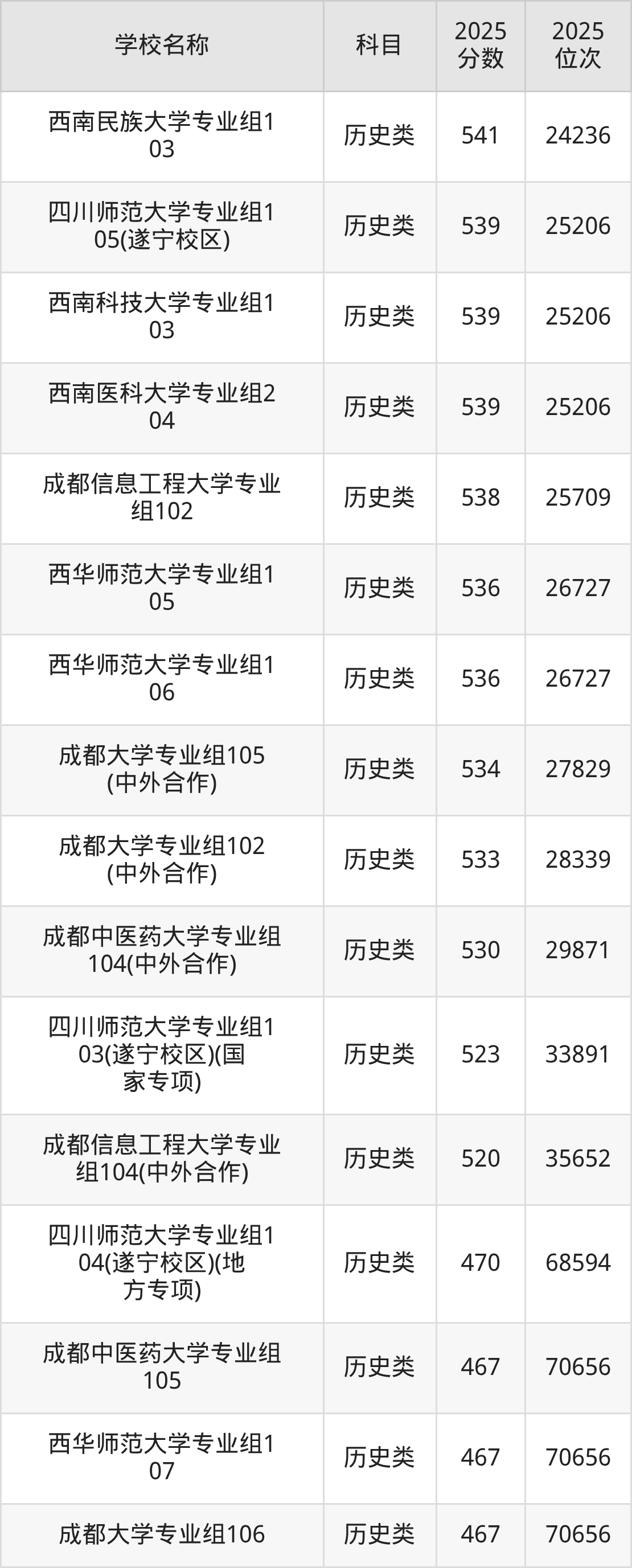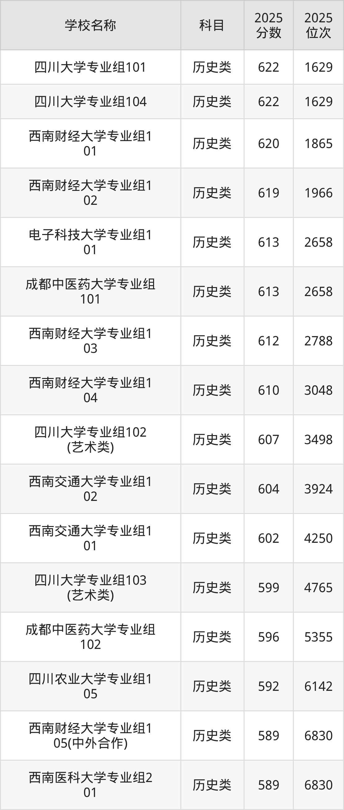 下文为2025年四川省一本大学在四川历史类录取分数线和位次排名表,供大家参考: