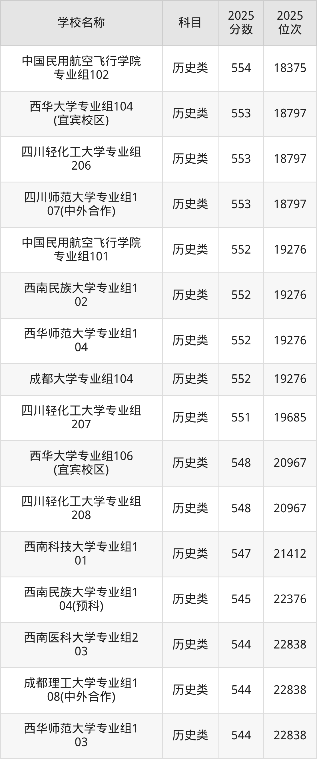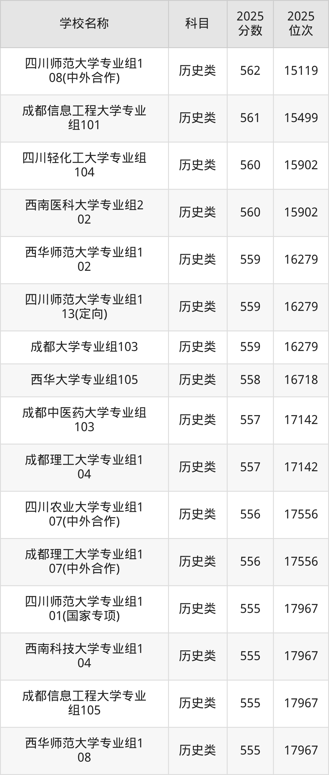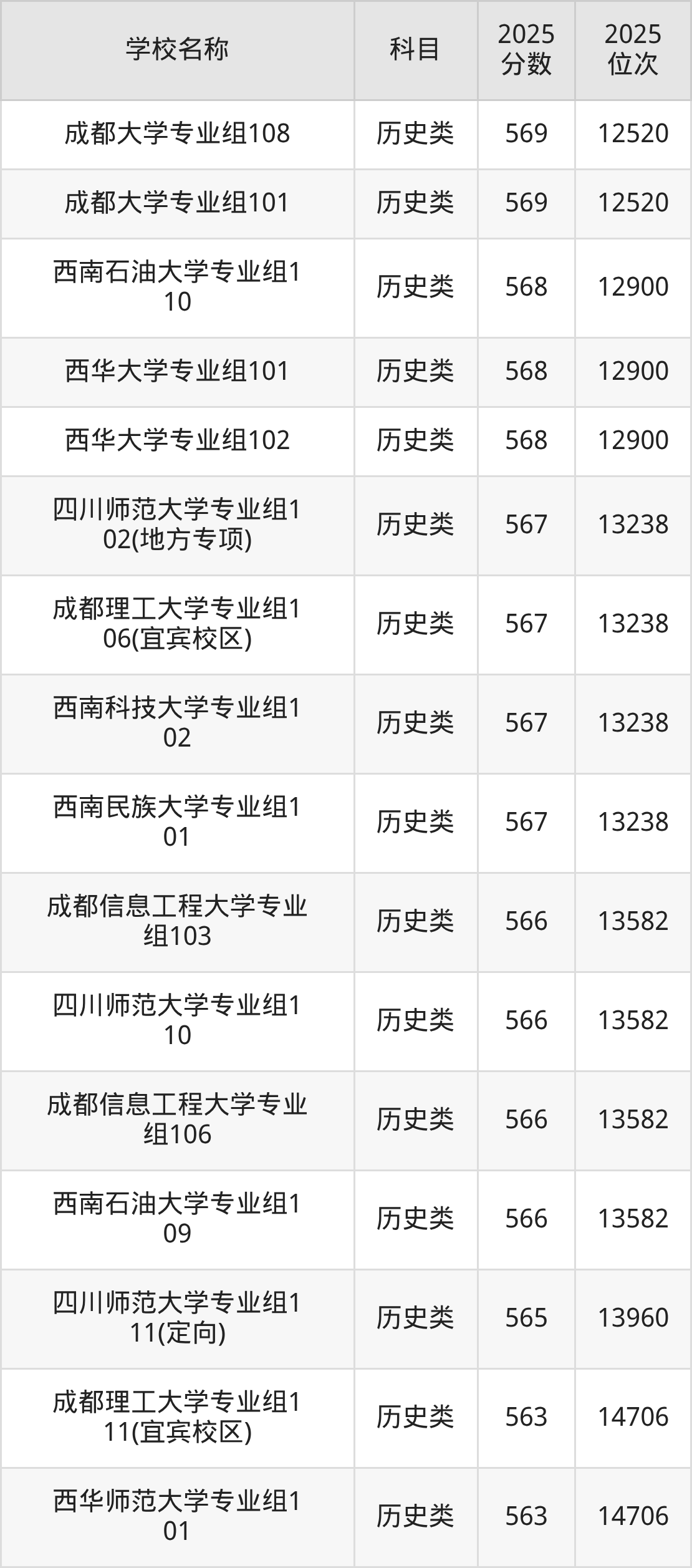 下文为2025年四川省一本大学在四川历史类录取分数线和位次排名表,供大家参考: